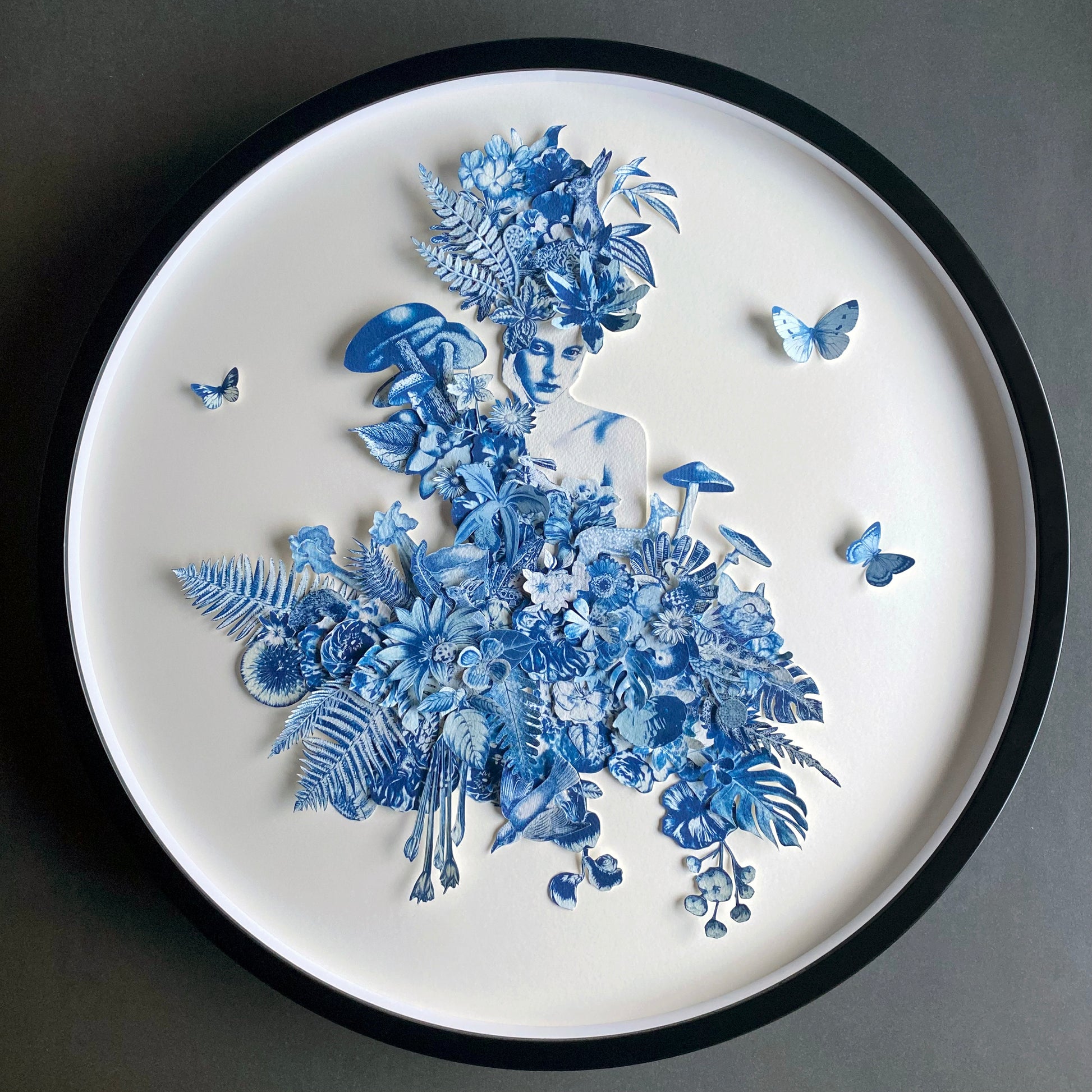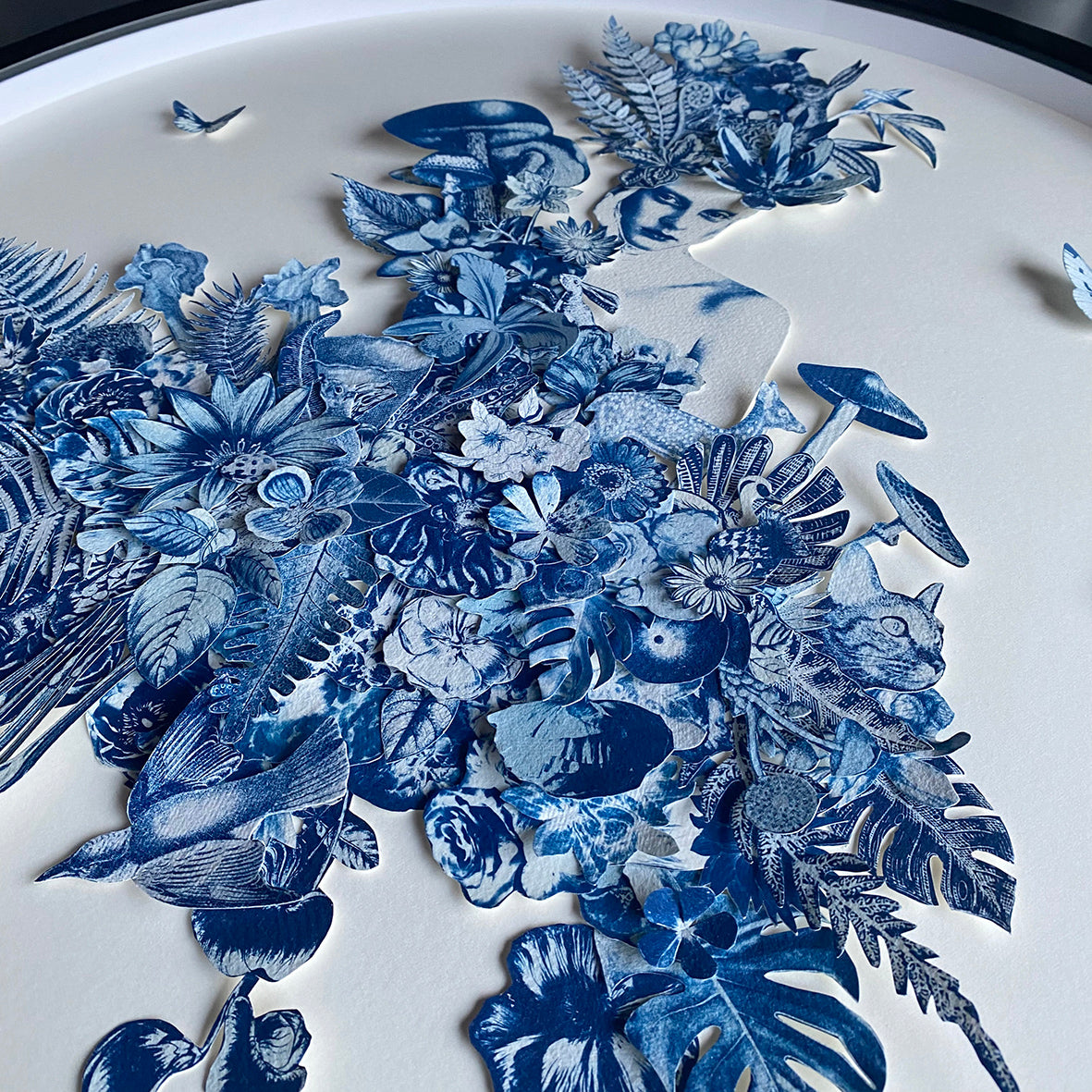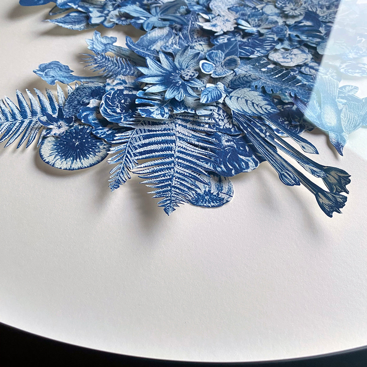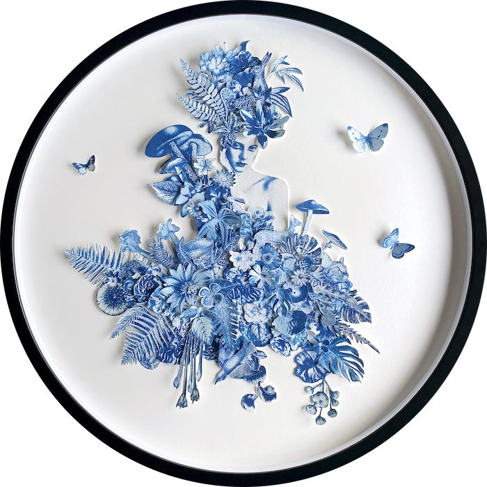 Materials | Cyanotype, 3D paper cut, multi layered collage, handmade paper 23.6in Frame diameter x 1.2in frame depth
