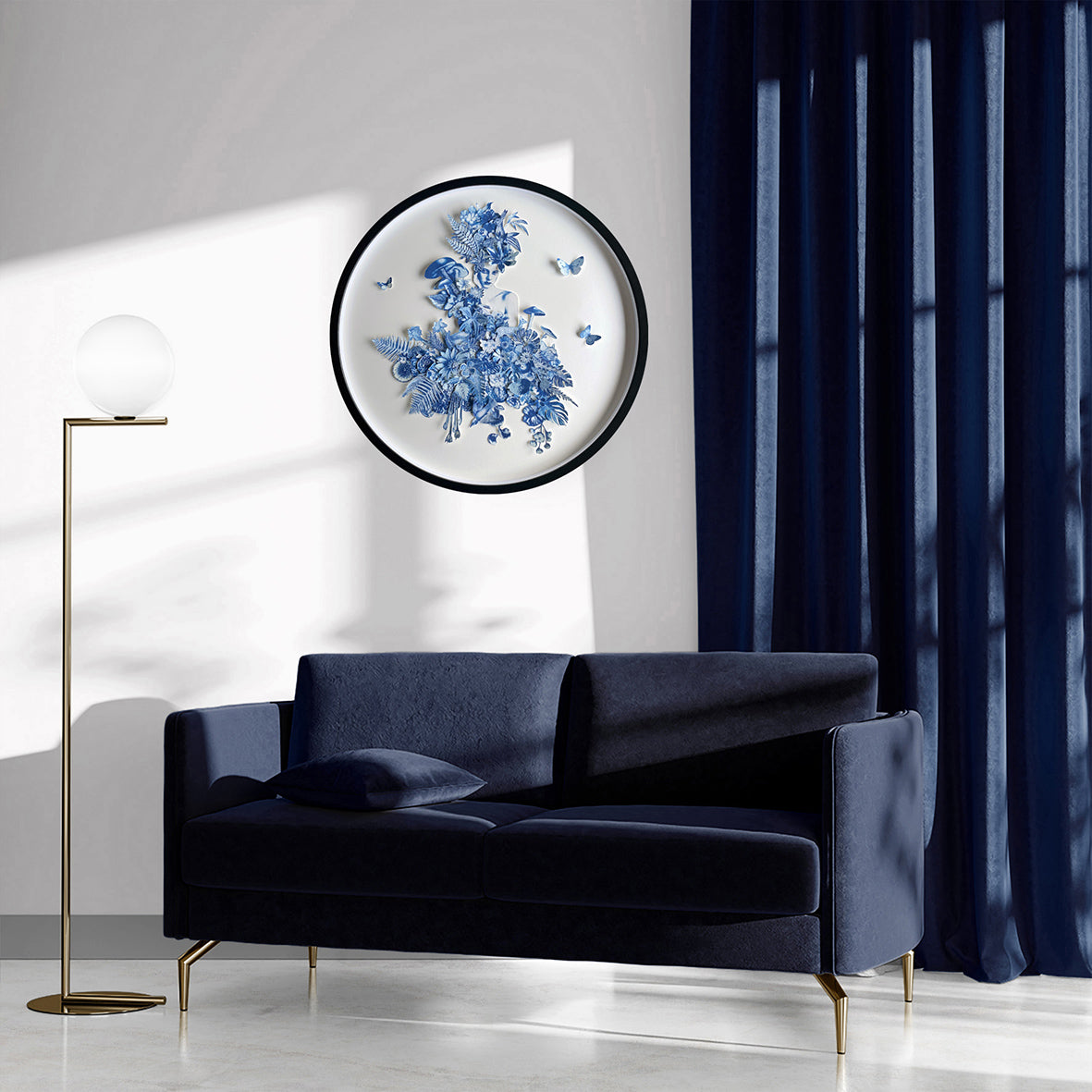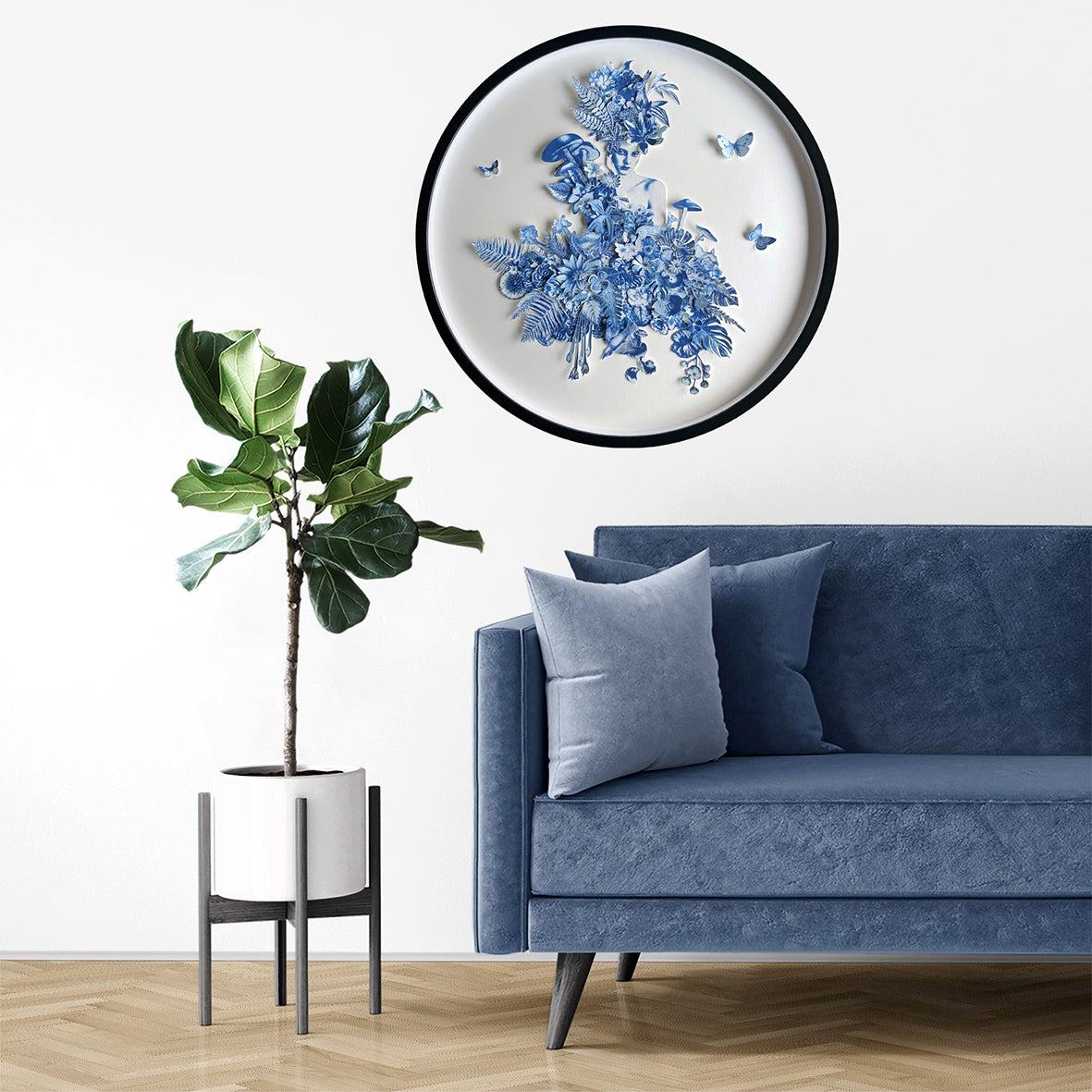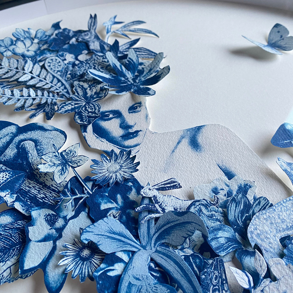 Materials | Cyanotype, 3D paper cut, multi layered collage, handmade paper 23.6in Frame diameter x 1.2in frame depth