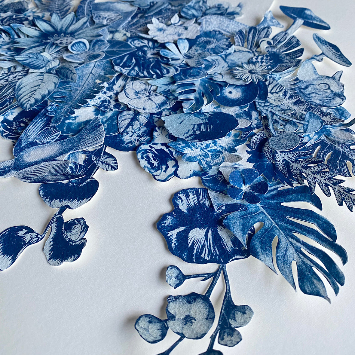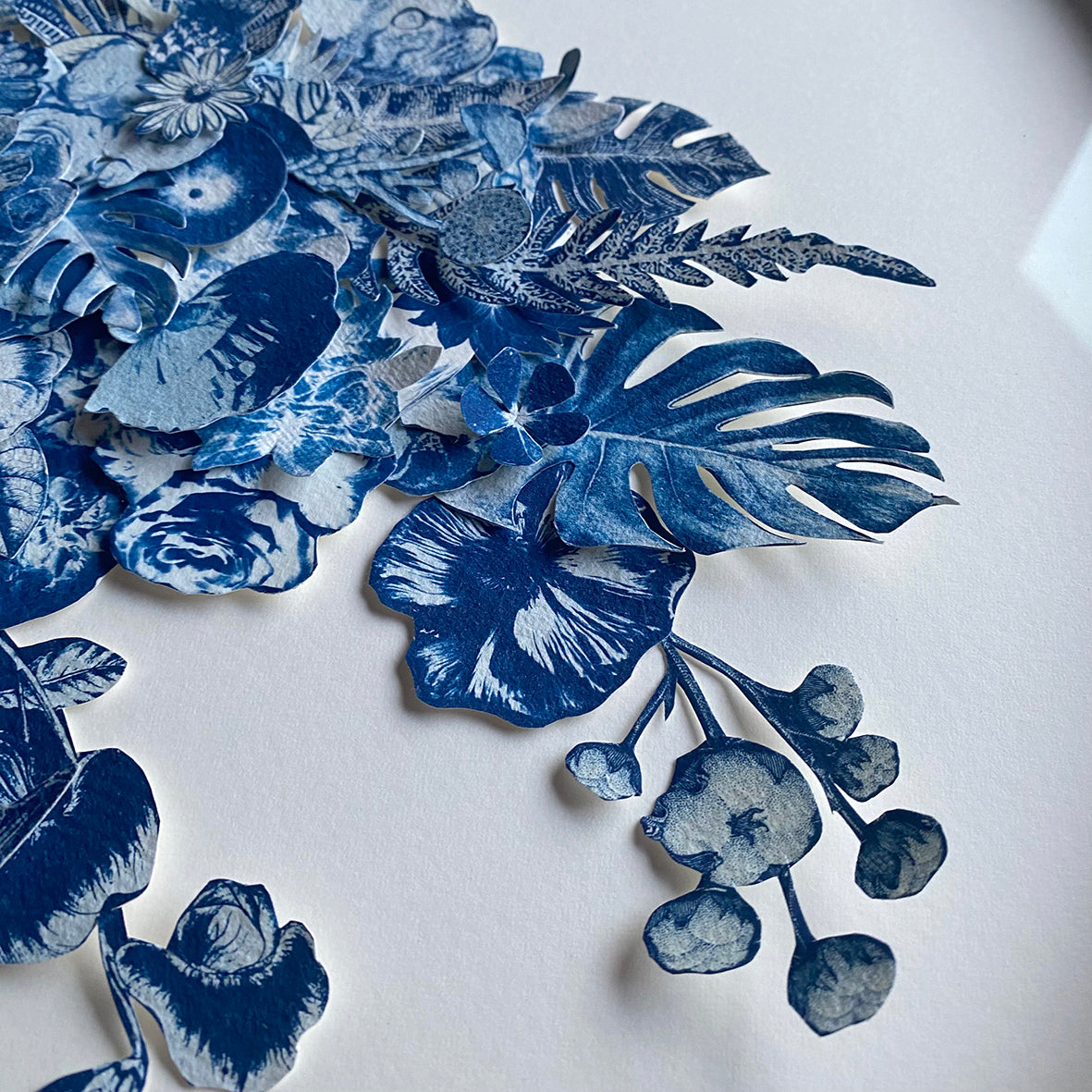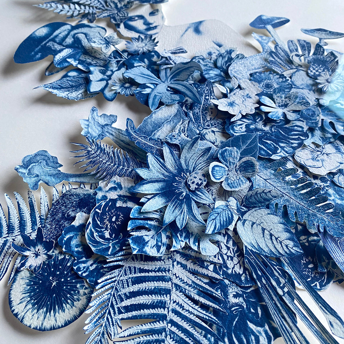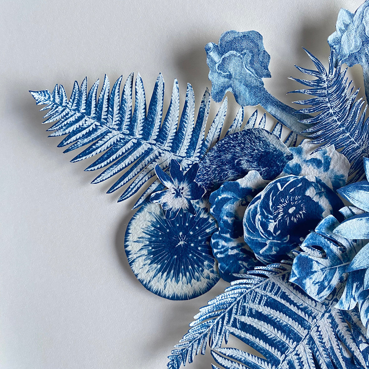 After coating the handmade paper with light-sensitive chemistry, it is left to dry in a dark room. The large-scale negatives are contact printed onto the paper by exposure to daylight (UV rays) for up to a month, depending on the weather, the seasons and the intensity of light. The prints are then processed by thoroughly washing in water to remove any unexposed solution, then be hung to dry, developing to full density Prussian blue after 24 hours. Once dry the individual parts are cut out and collaged together to create a multi layered, 3D artwork.