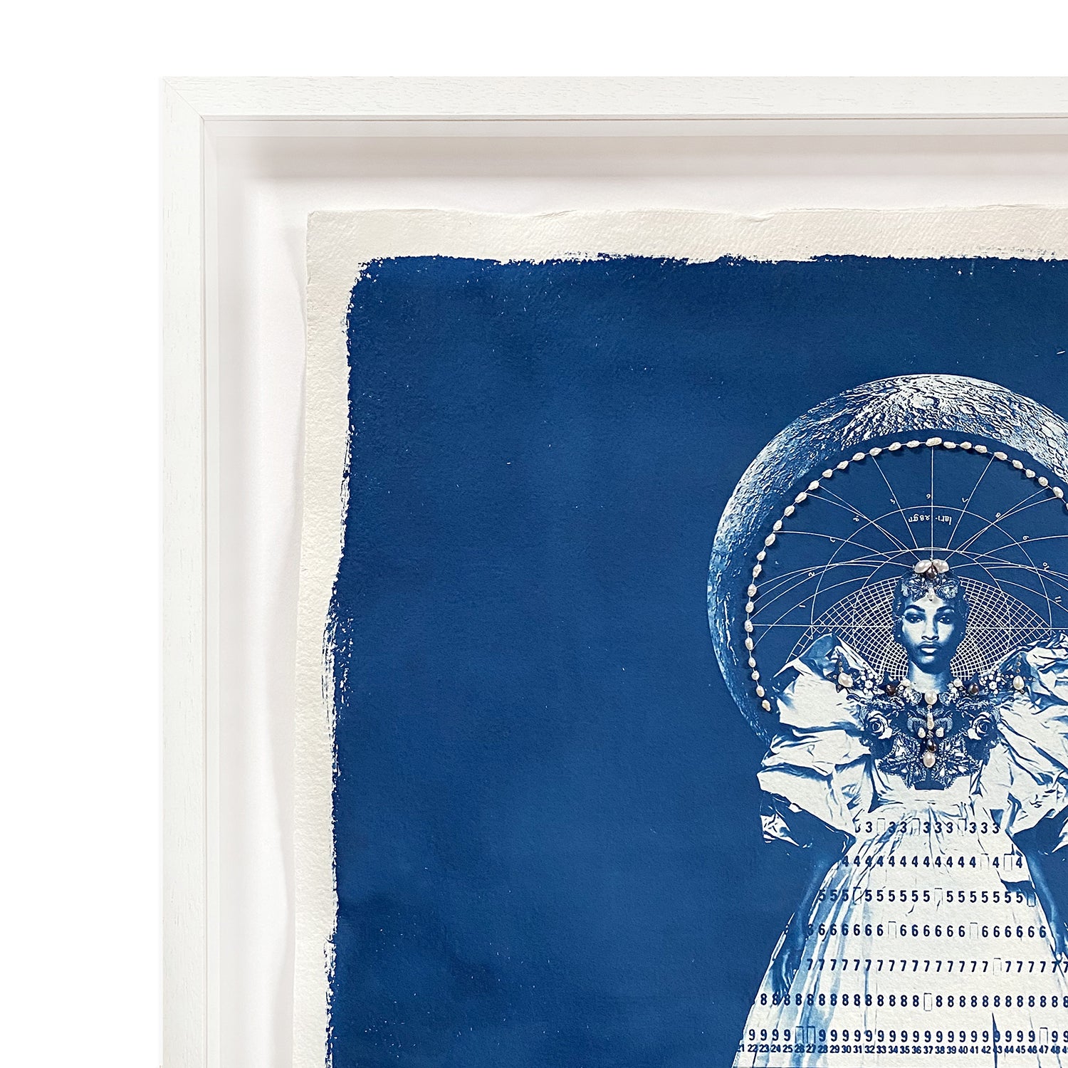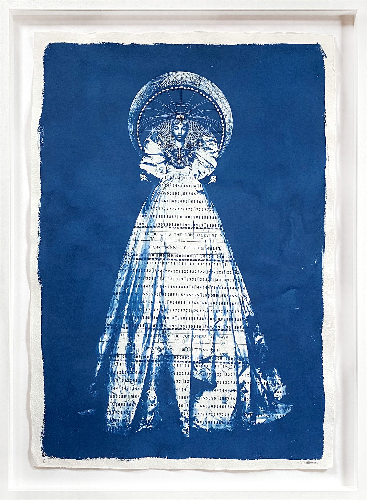 Breaking Barriers (Ode To Dorothy Vaughan) was created by constructing a hand-cut collage using photographic portraiture, a halo made from an illustration of mathematical apparatus and an astrolabe, photographs of the moon and overlays of FORTRAN computer punch cards. Her dress is made of paper and I included photographs of antique jewellery representing the symbols of AKA sorority along with hand stitching natural pearls.