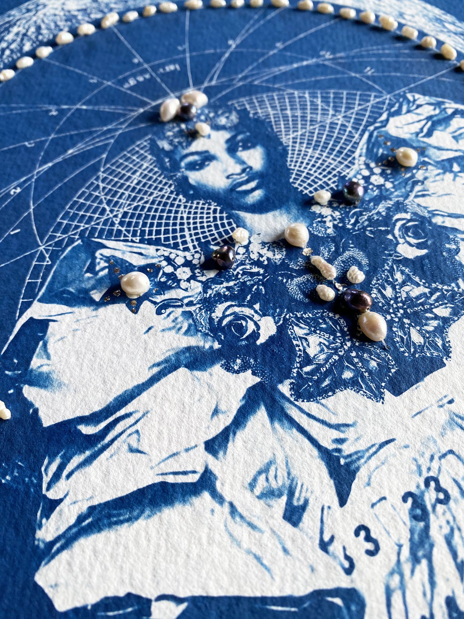 Materials | Cyanotype, handmade paper, 6-carat white gold leaf and hand stitched natural pearls