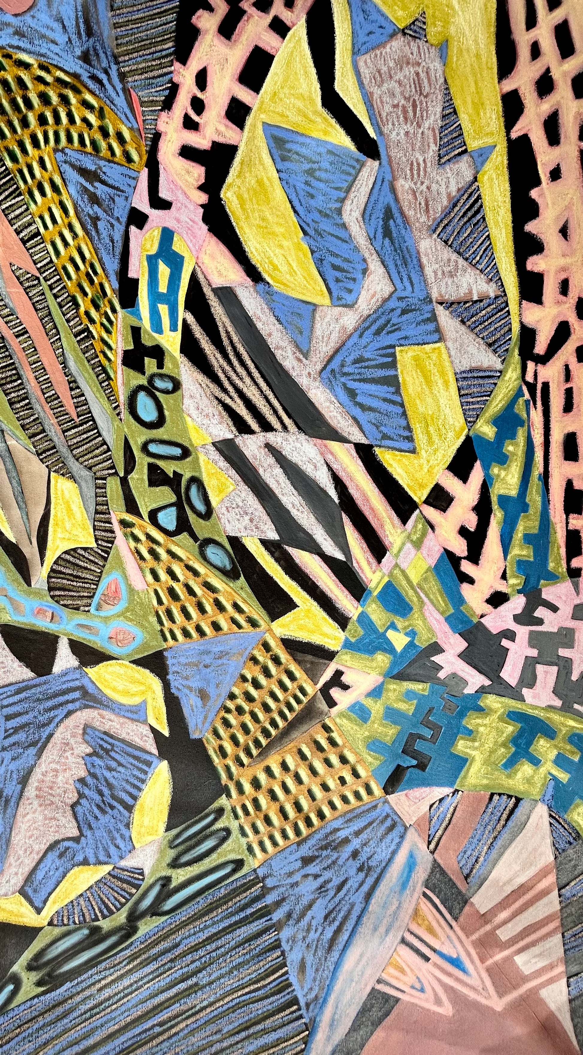 Acrylic, latex paint, carpet tacks, oil pastel on canvas