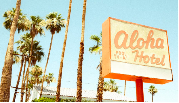 Basking under the endless Palm Springs sun, Faded Paradise captures the nostalgia of roadside Americana, where dreams of escape linger in the desert air. The Aloha Hotel sign, weathered by time, promises a getaway—Pool. TV. A/C.—simple luxuries that once symbolized a taste of paradise.
