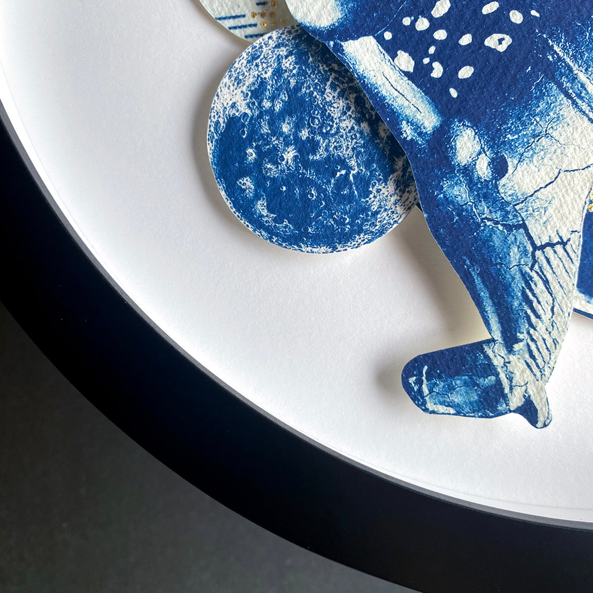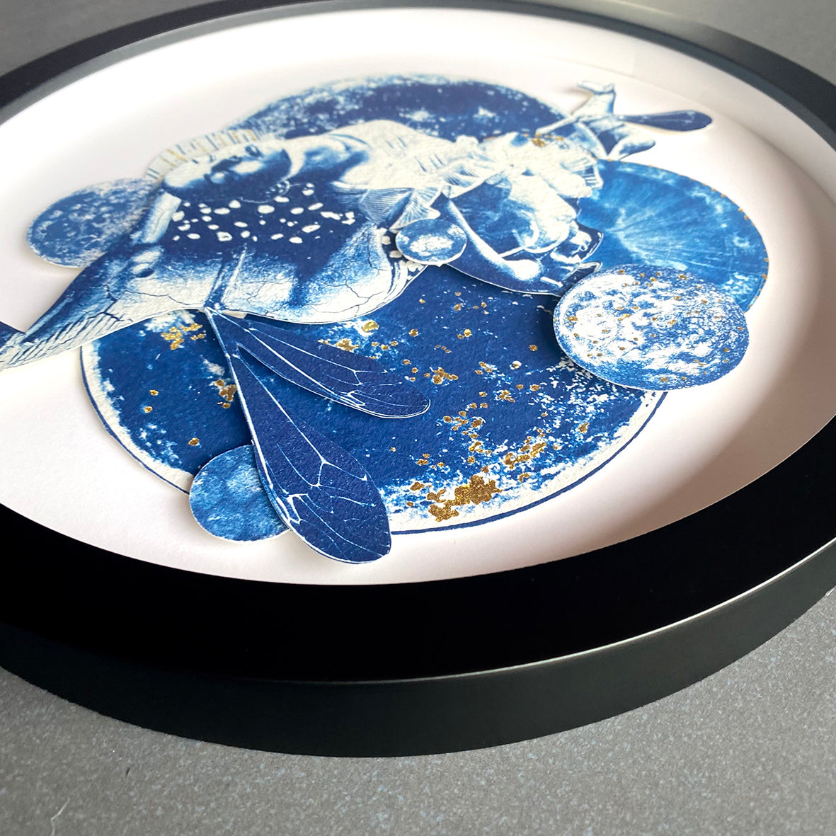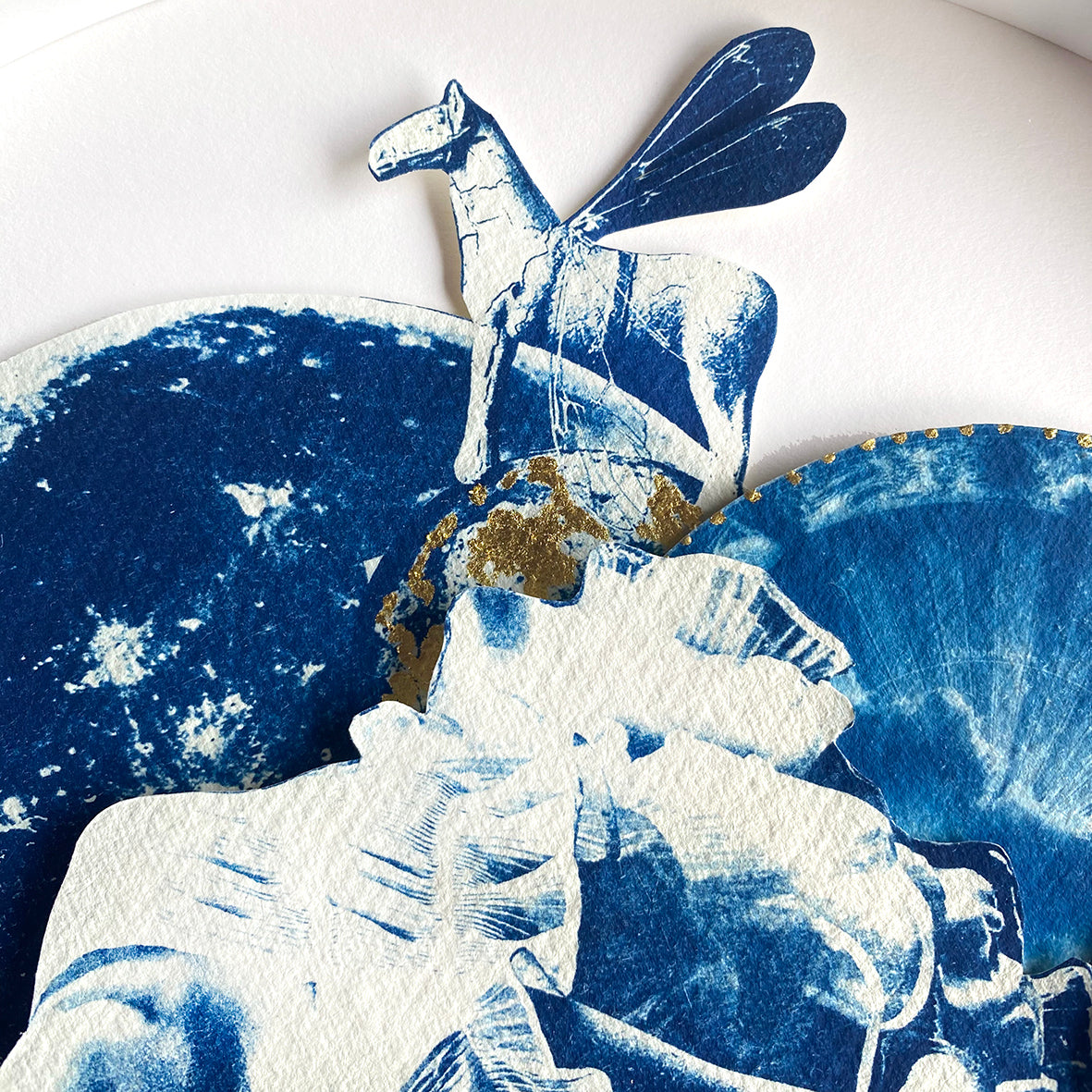 Once dried, the pieces are cut out and mounted onto the base print to create a multi-layered, 3-dimensional collaged cyanotype and hand finished with 24-carat gold leaf.