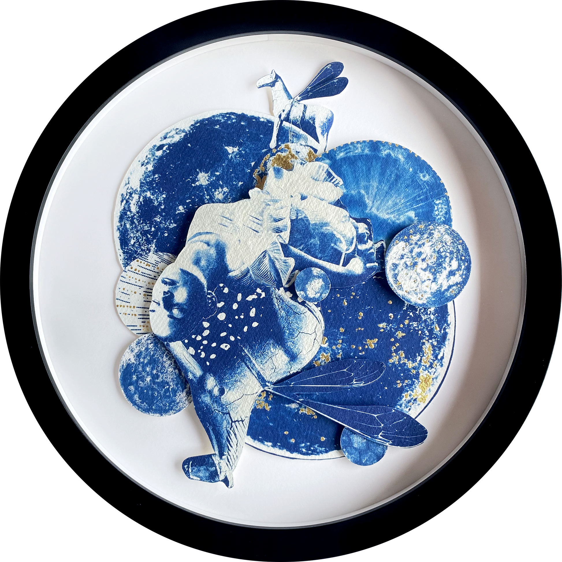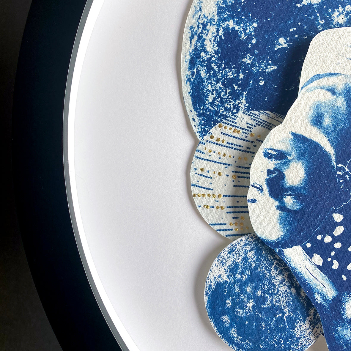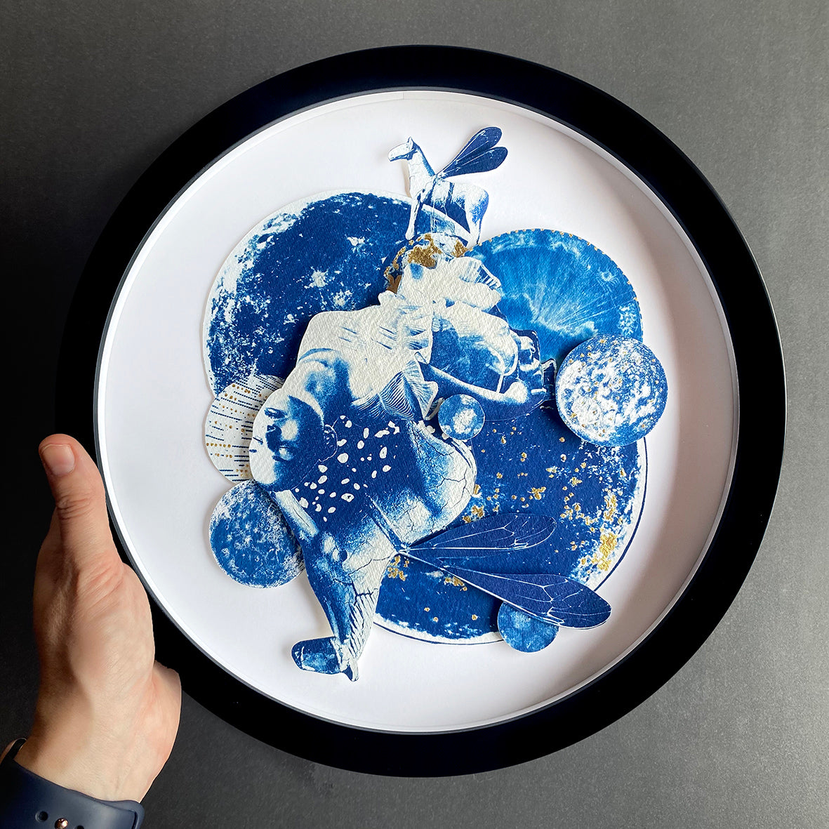 Once dried, the pieces are cut out and mounted onto the base print to create a multi-layered, 3-dimensional collaged cyanotype and hand finished with 24-carat gold leaf.