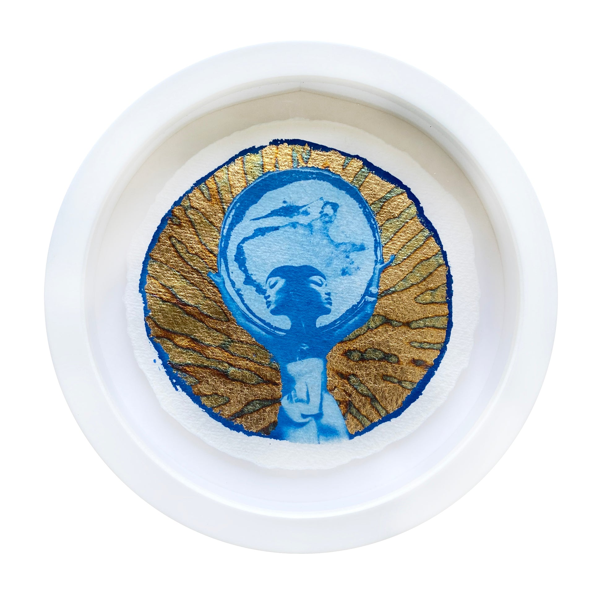 Materials | Cyanotype, handmade paper, chemically painted, heat treated zinc leaf 5.7in frame diameter x 1.2in frame depth