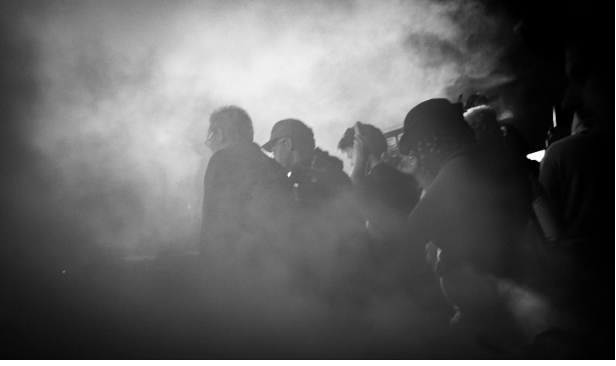 The grainy texture and shadowy silhouettes create an almost dreamlike atmosphere—this isn’t just a party; it’s a collective experience, a fleeting moment where nothing else exists except the beat, the people, and the evening.