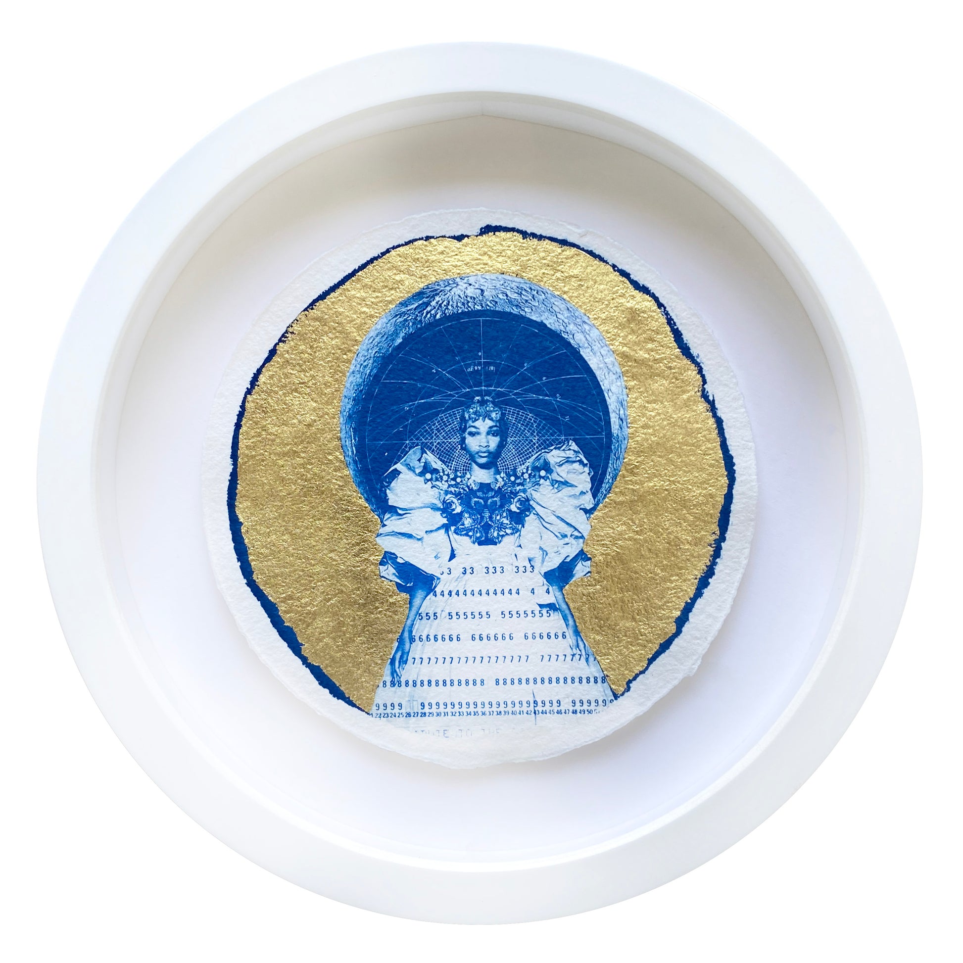 Materials | Cyanotype, handmade paper, 24-carat gold leaf 8.3in frame diameter x 1.2in frame depth