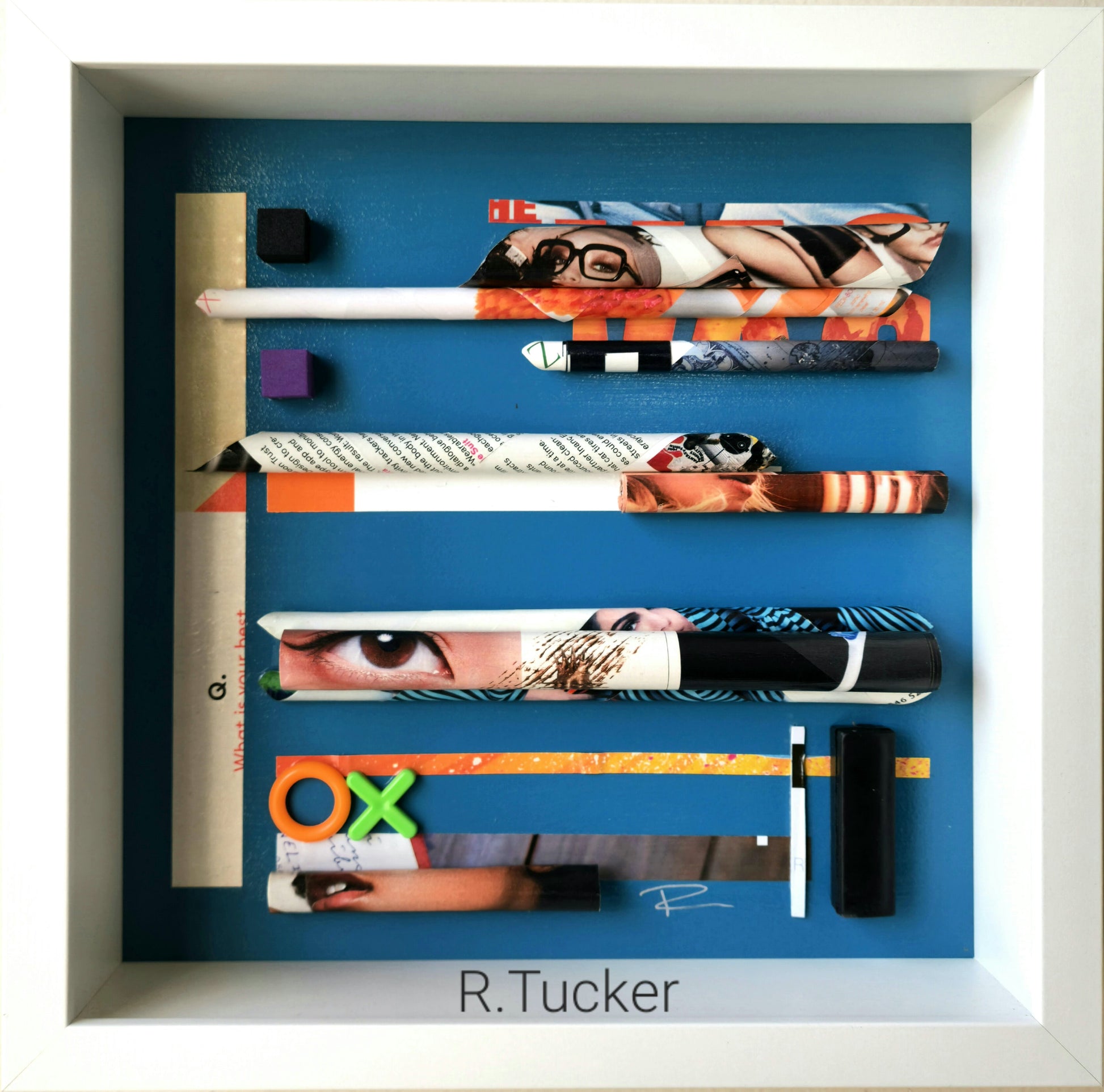 Material: Collage and recycled rolled magazines on foamboard