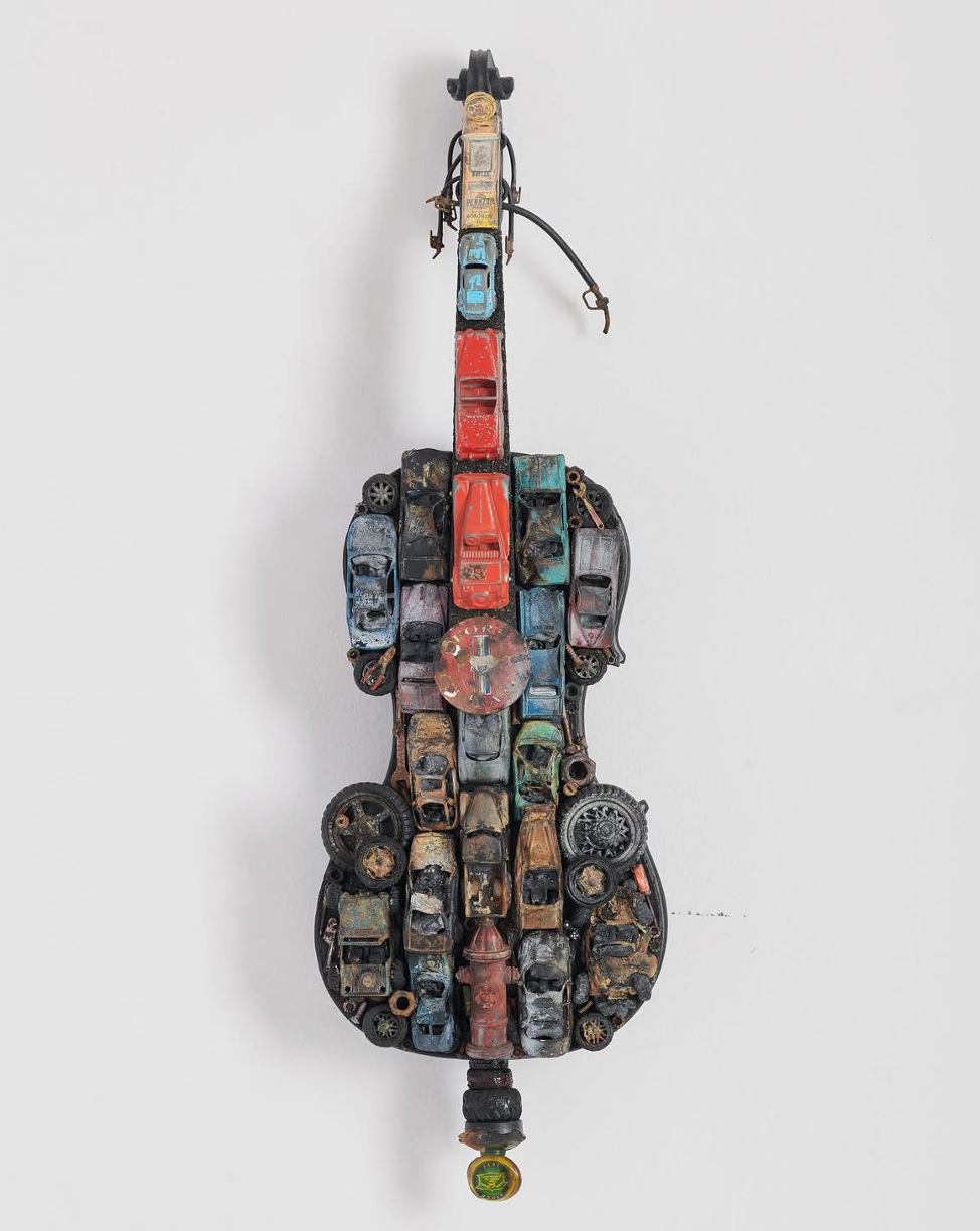 Out of Gas ~ Torched violin with burned hotwheels and matchbox car and found objects; Vintage Cars: 1965 TVR, 1953 Cadillac, 1930’s Morgan; 36.5” x 8” x 5”