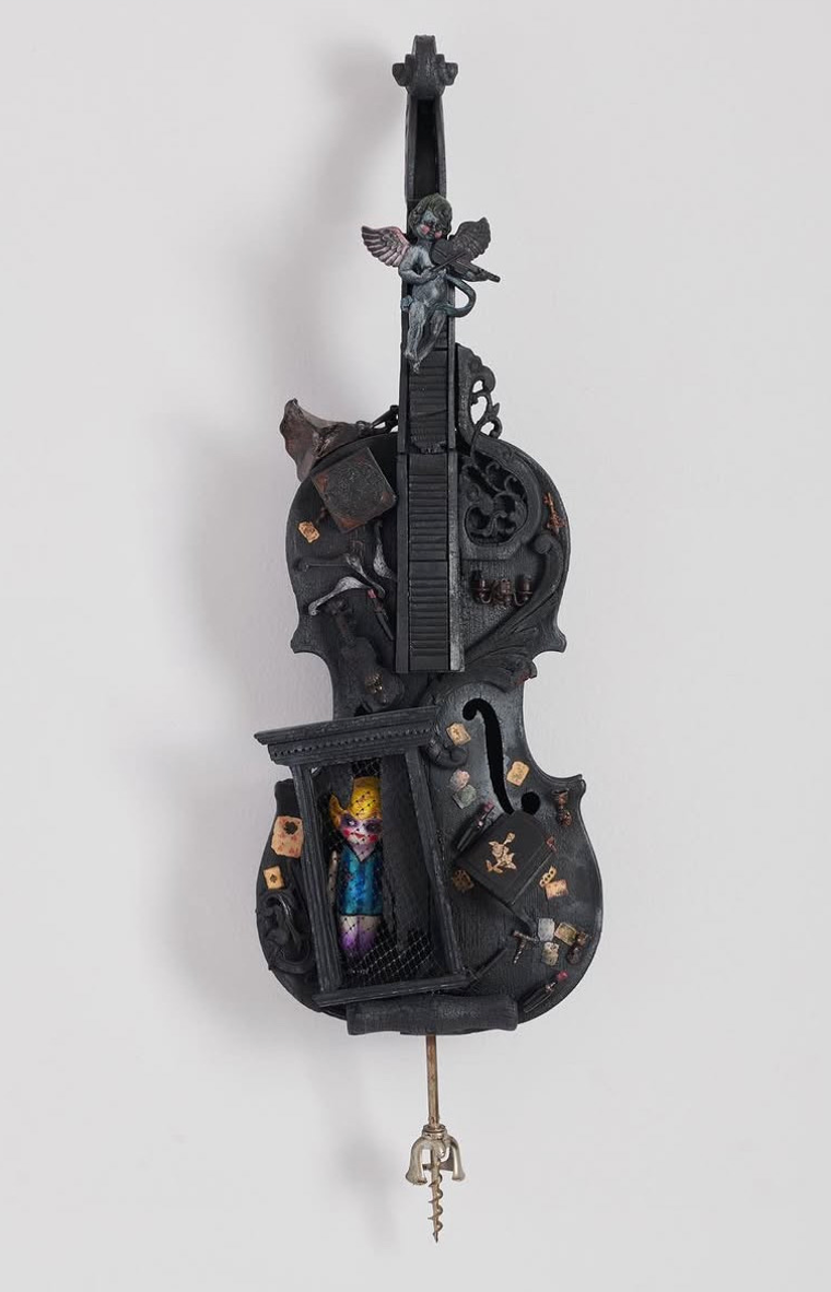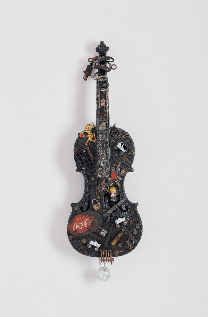 Party Girl ~ Torched violin, found objects, mixed media; 26” x 8” x 5”