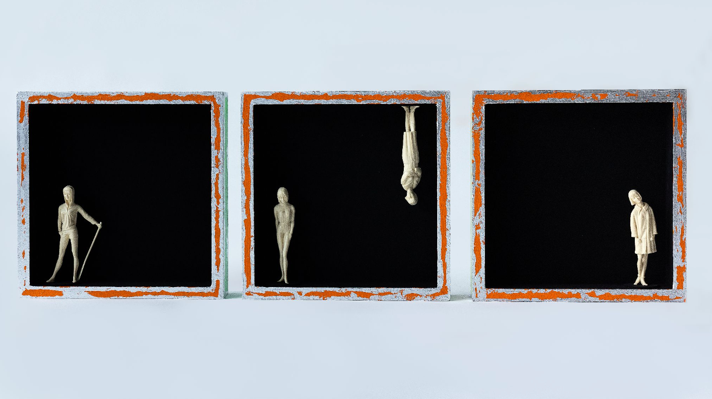 Musou black paint (Japan) - “the world’s blackest black,” plastic dolls, acrylic, aluminum leaf on board