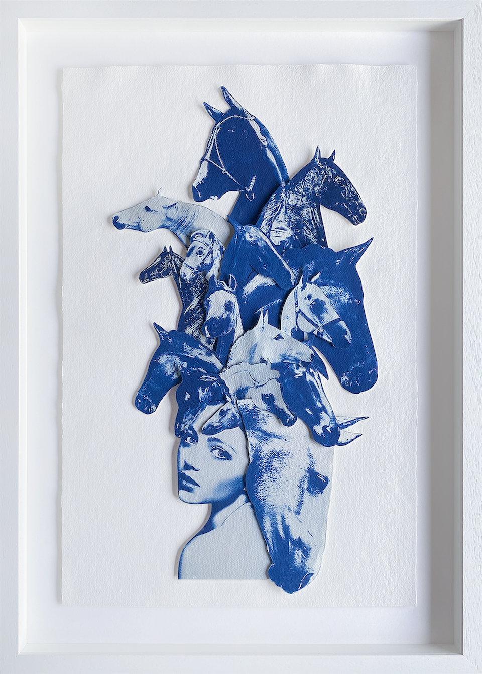 Queen Boudicca- A Life in Legend was created by constructing a hand-cut collage using female photographic portraiture and hand drawn illustrations and photographs of horses and tin models.