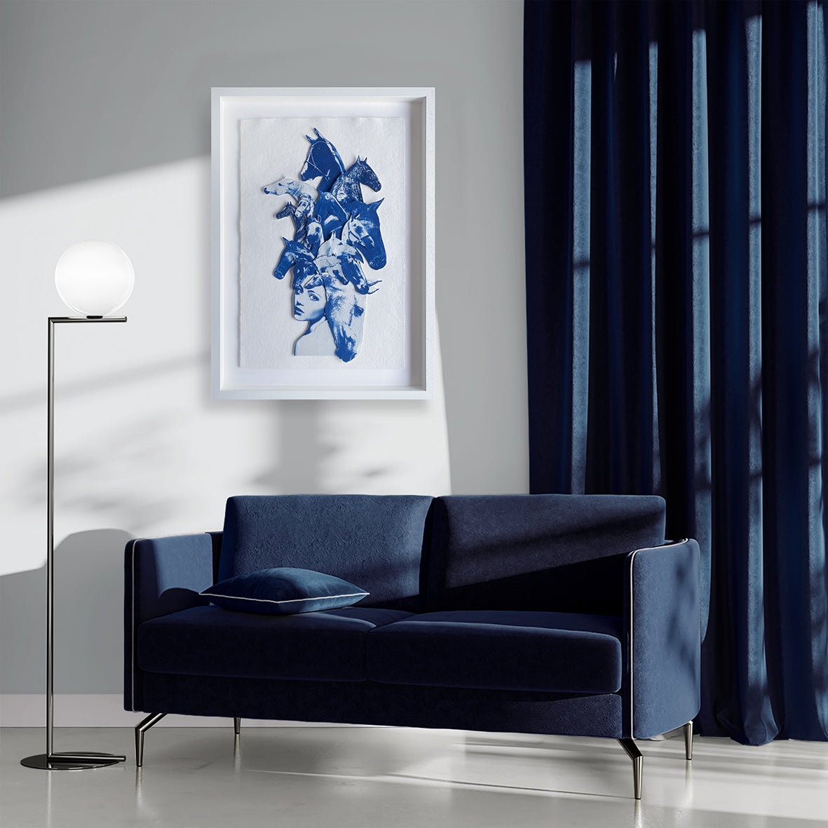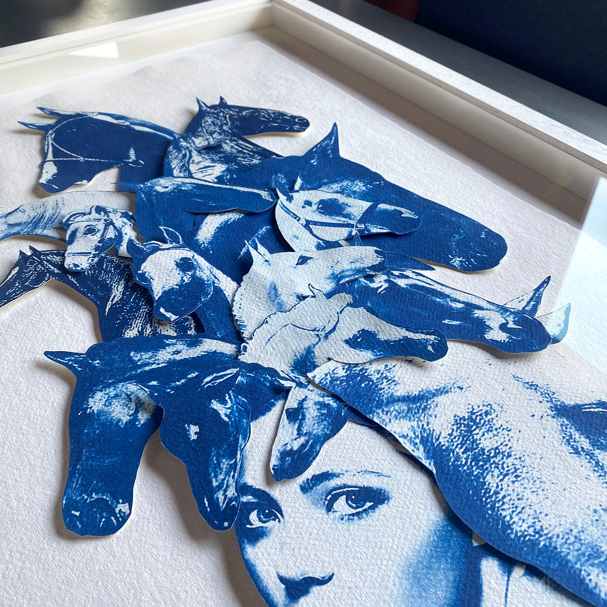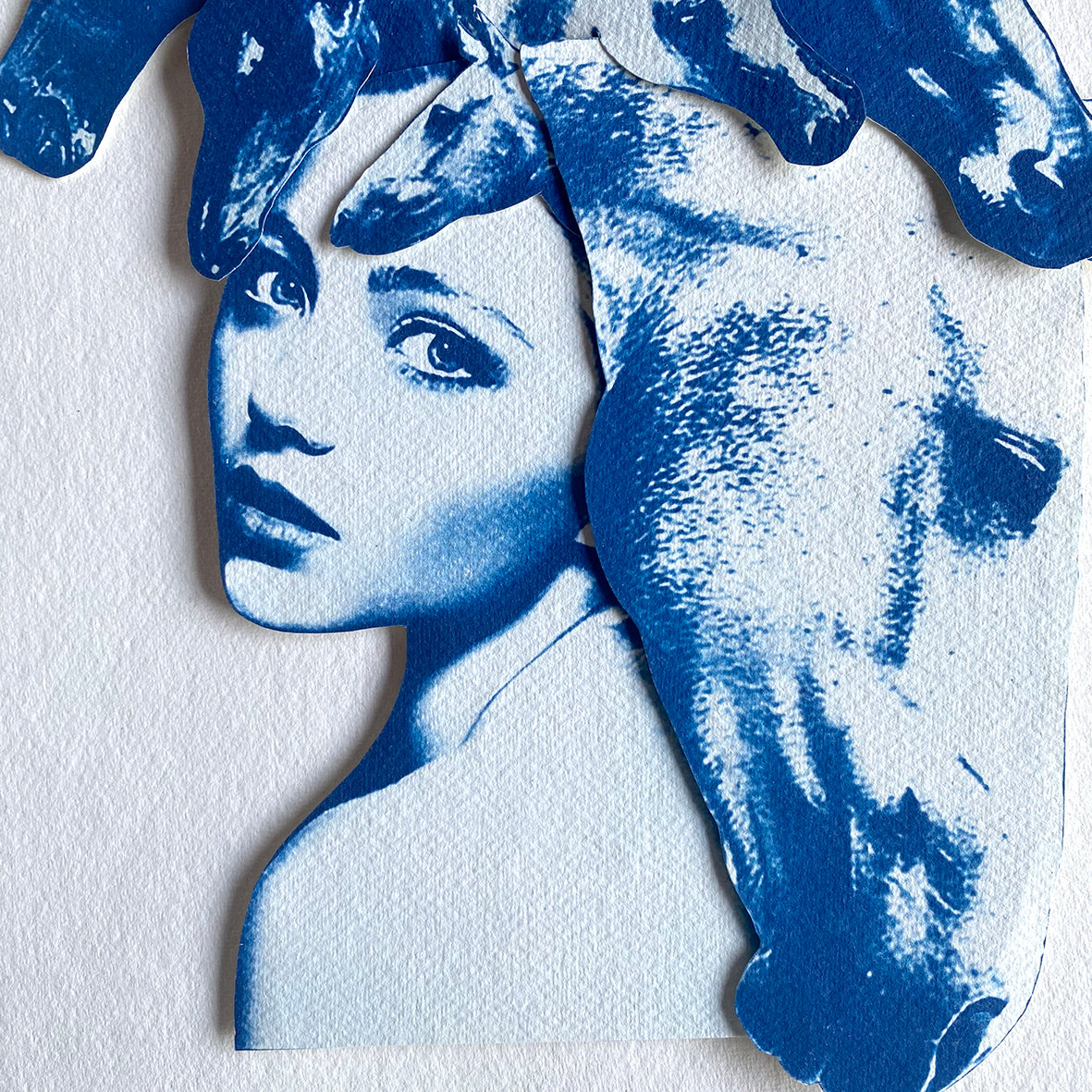 Materials | Cyanotype, handmade paper, papercut collage 21.85 in x 30.5in x 2.17in (frame depth)