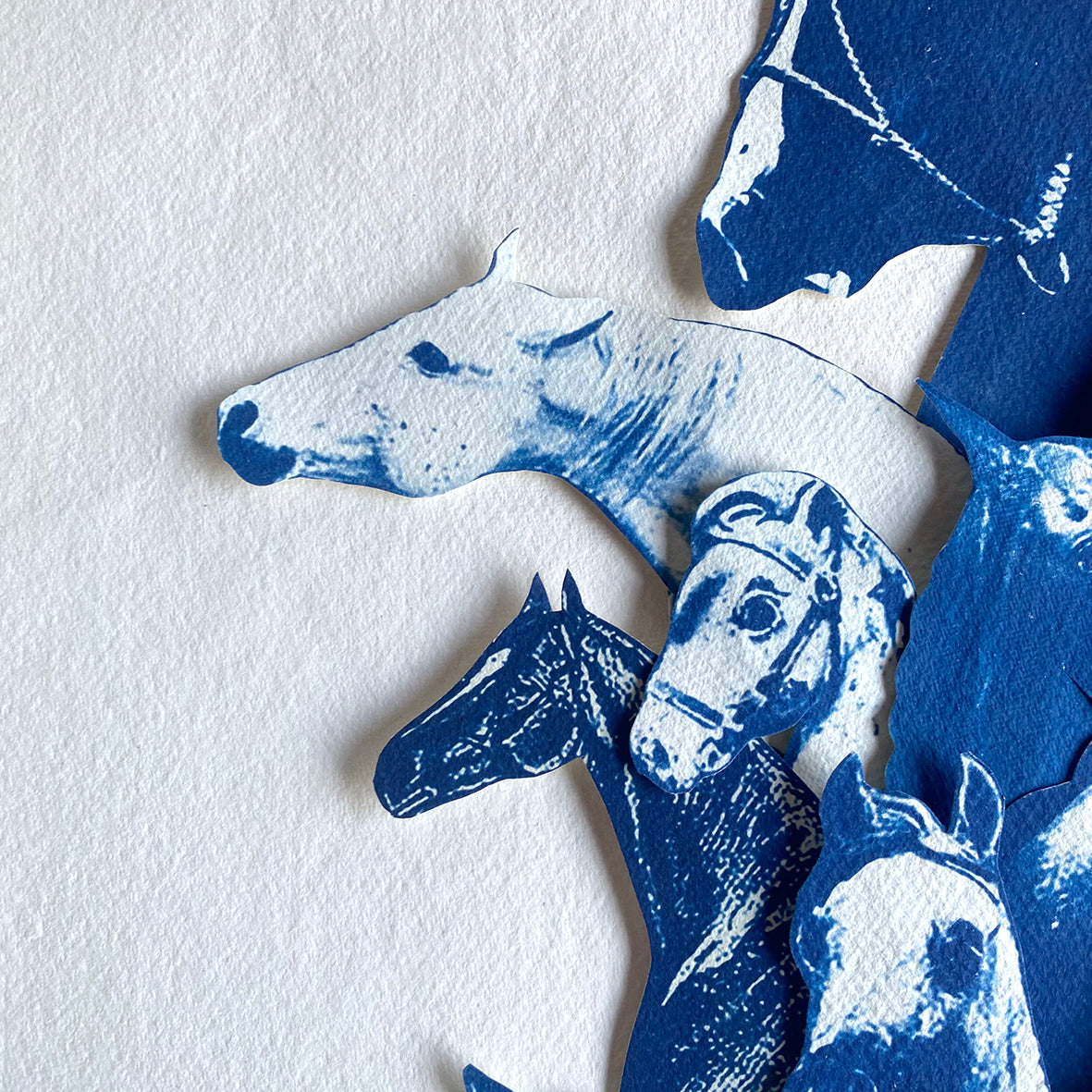 The prints are then processed by thoroughly washing in water to remove any unexposed solution. It can then be hung to dry, developing to full density Prussian blue after 24 hours. Once dried the individual component parts are cut out and mounted onto the print to create a multi-layered, 3-dimensional artwork.