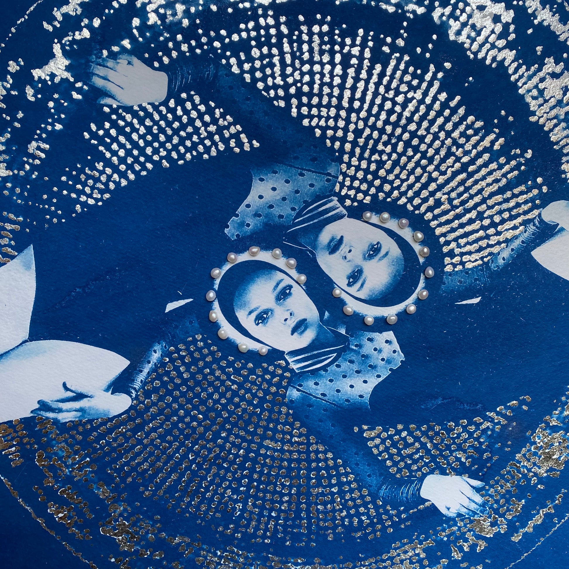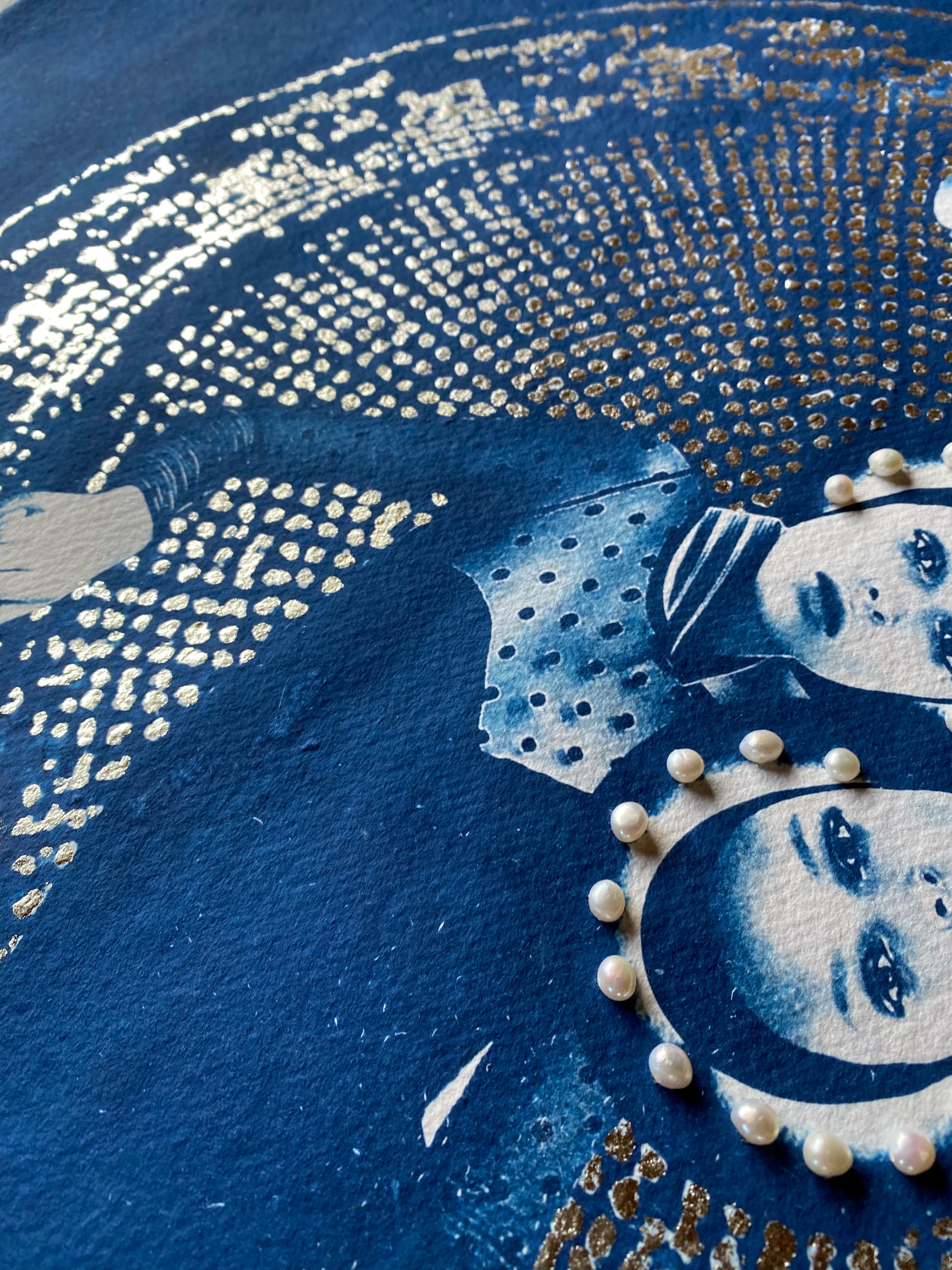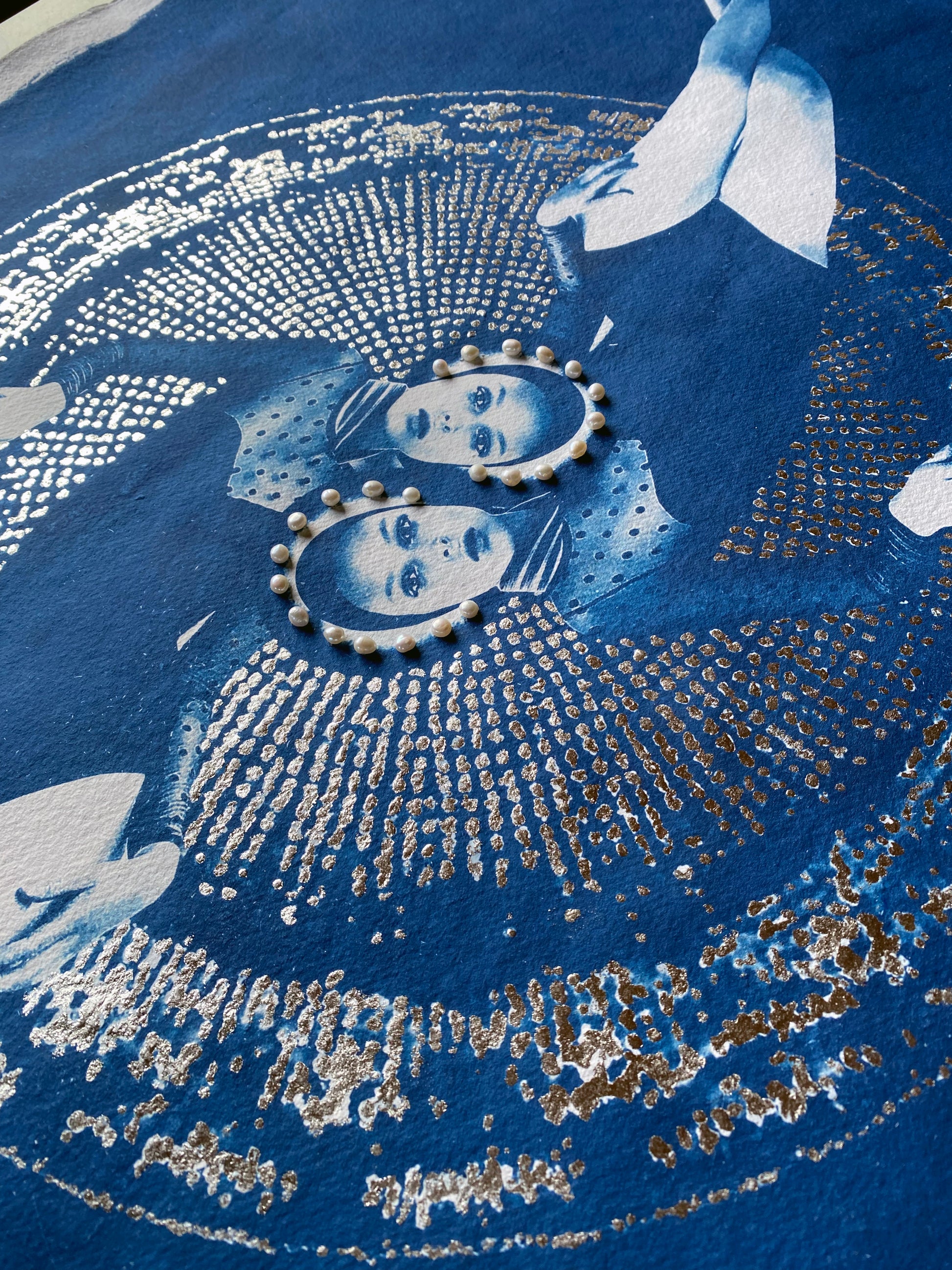 After coating the handmade paper with light-sensitive chemistry, it is left to dry in a dark room. The large-scale negative was contact printed onto the paper by exposure to daylight (UV rays). The print is then processed by thoroughly washing in water to remove any unexposed solution. It can then be hung to dry, developing to full density Prussian blue after 24 hours. Once dried I hand applied the 6-carat white gold leaf and stitched the natural pearls to create the halo.