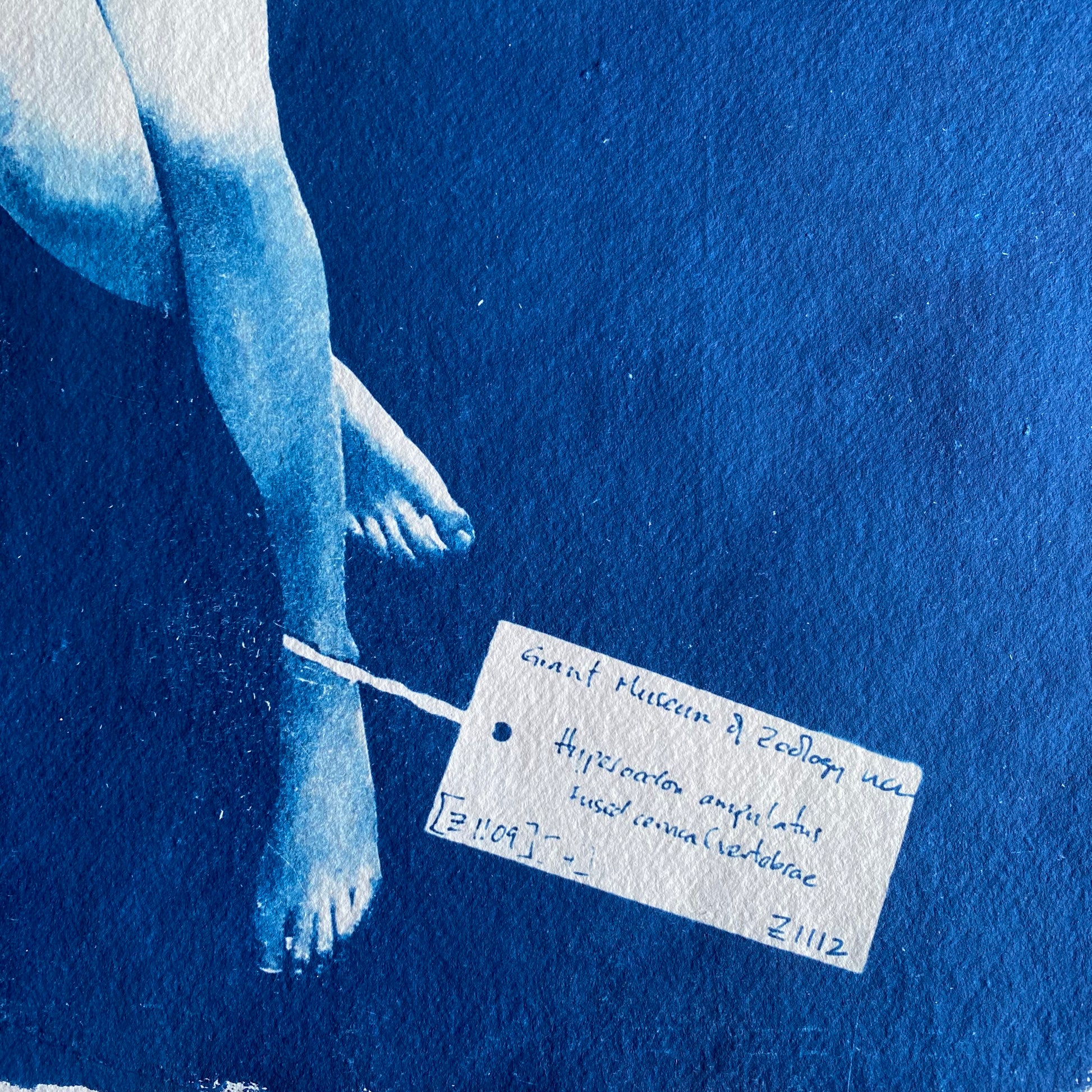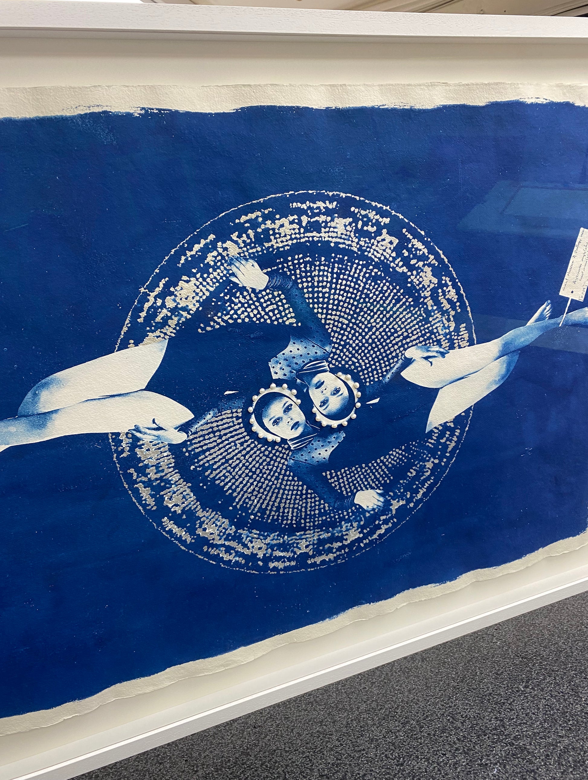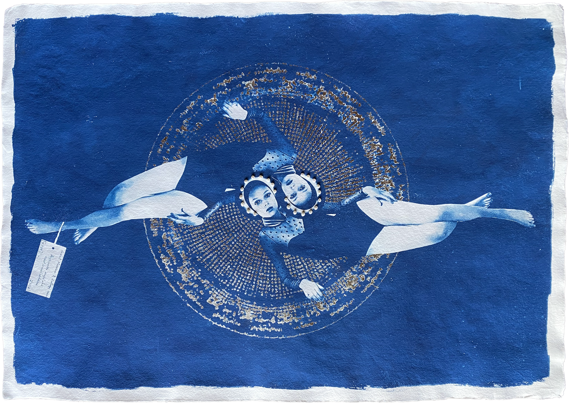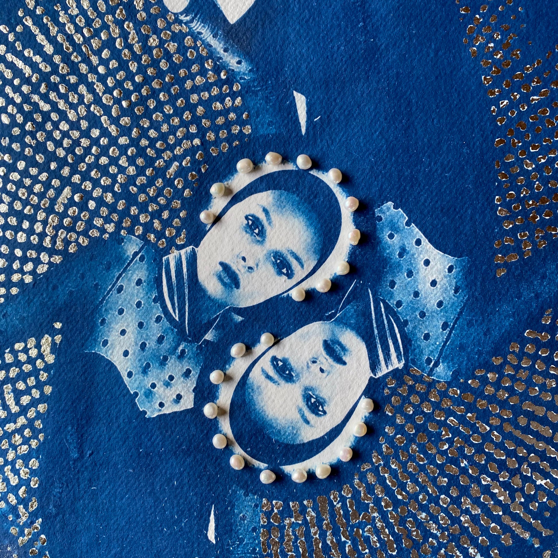 After coating the handmade paper with light-sensitive chemistry, it is left to dry in a dark room. The large-scale negative was contact printed onto the paper by exposure to daylight (UV rays). The print is then processed by thoroughly washing in water to remove any unexposed solution. It can then be hung to dry, developing to full density Prussian blue after 24 hours. Once dried I hand applied the 6-carat white gold leaf and stitched the natural pearls to create the halo.