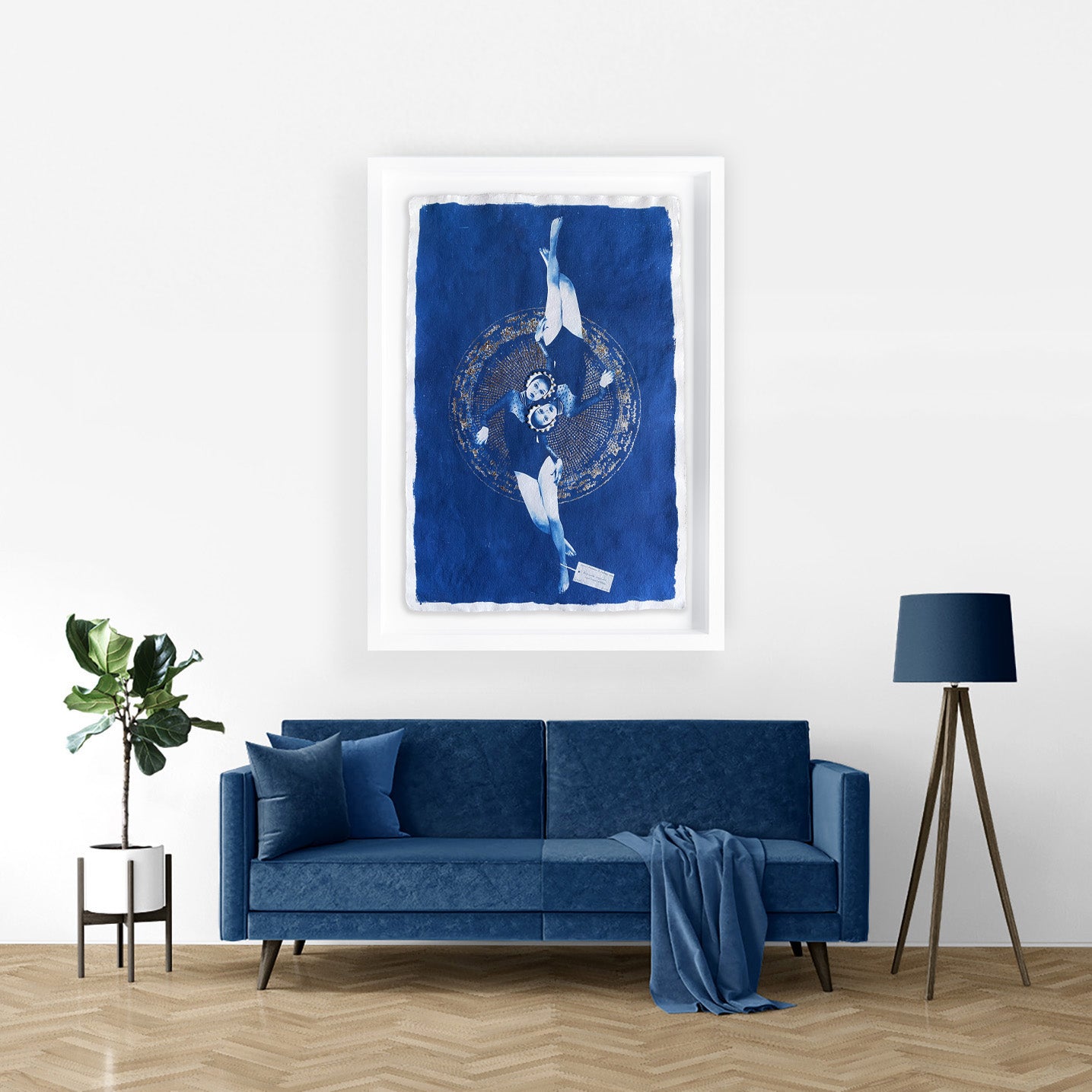 We use float mounting for all of our framed cyanotypes. The artwork floats above a snow-white 8001 mount board, to showcase the paper texture and deckled edging.