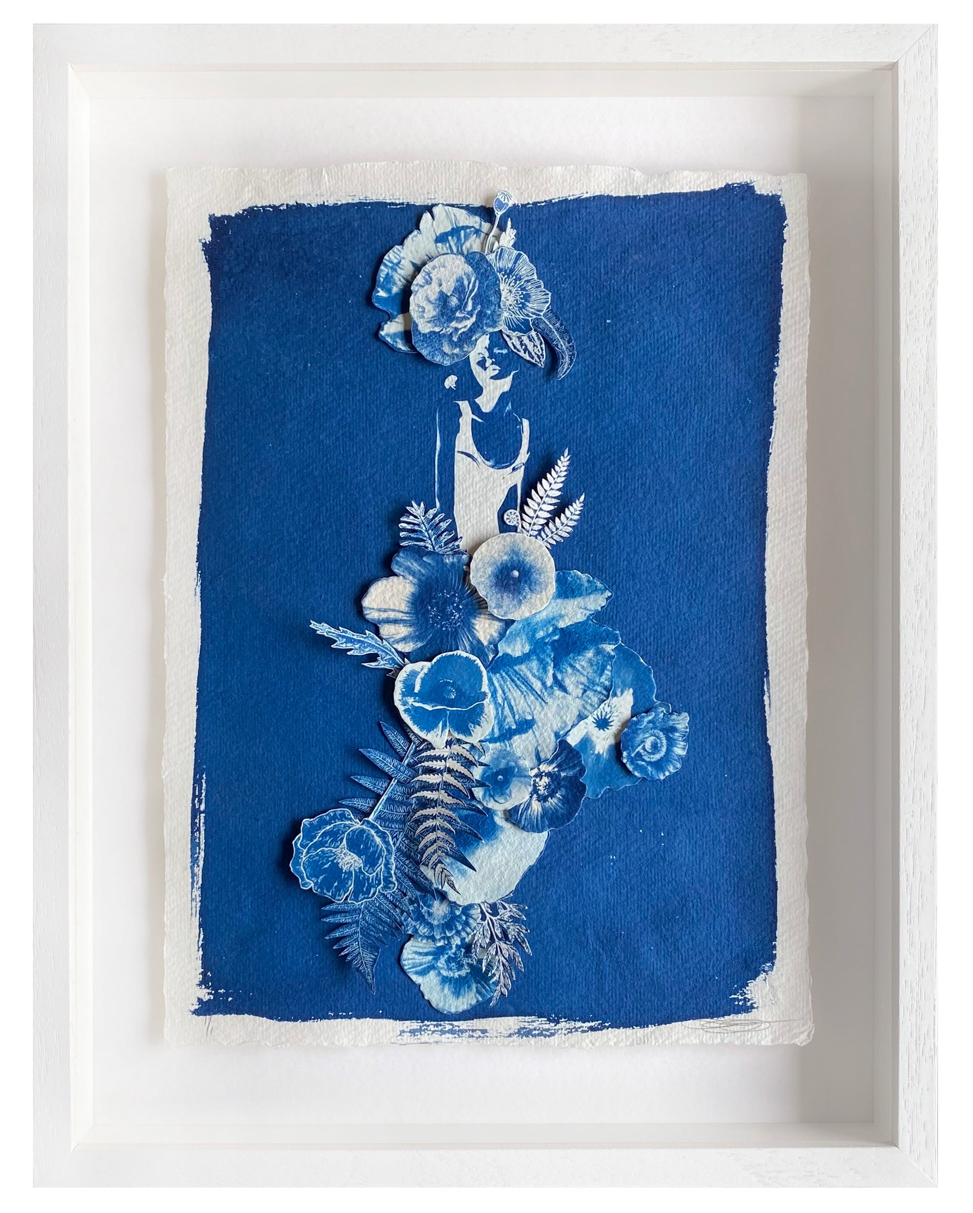 Materials | Cyanotype, 3D paper cut, multi layered collage, handmade paper 11.5in x 15in x 1.6in frame depth