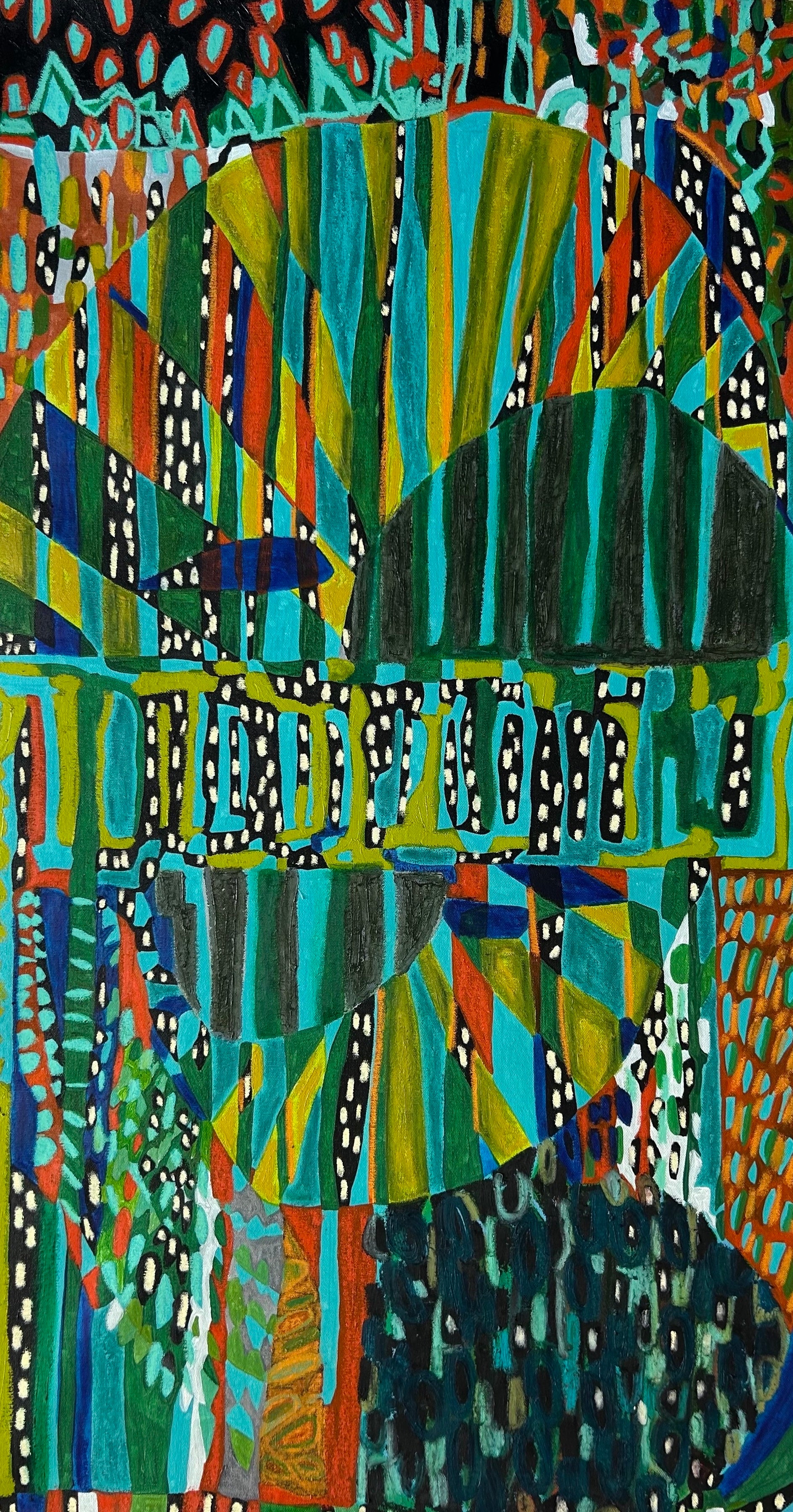 Acrylic, oil pastel, oil stick, rug tacks on canvas