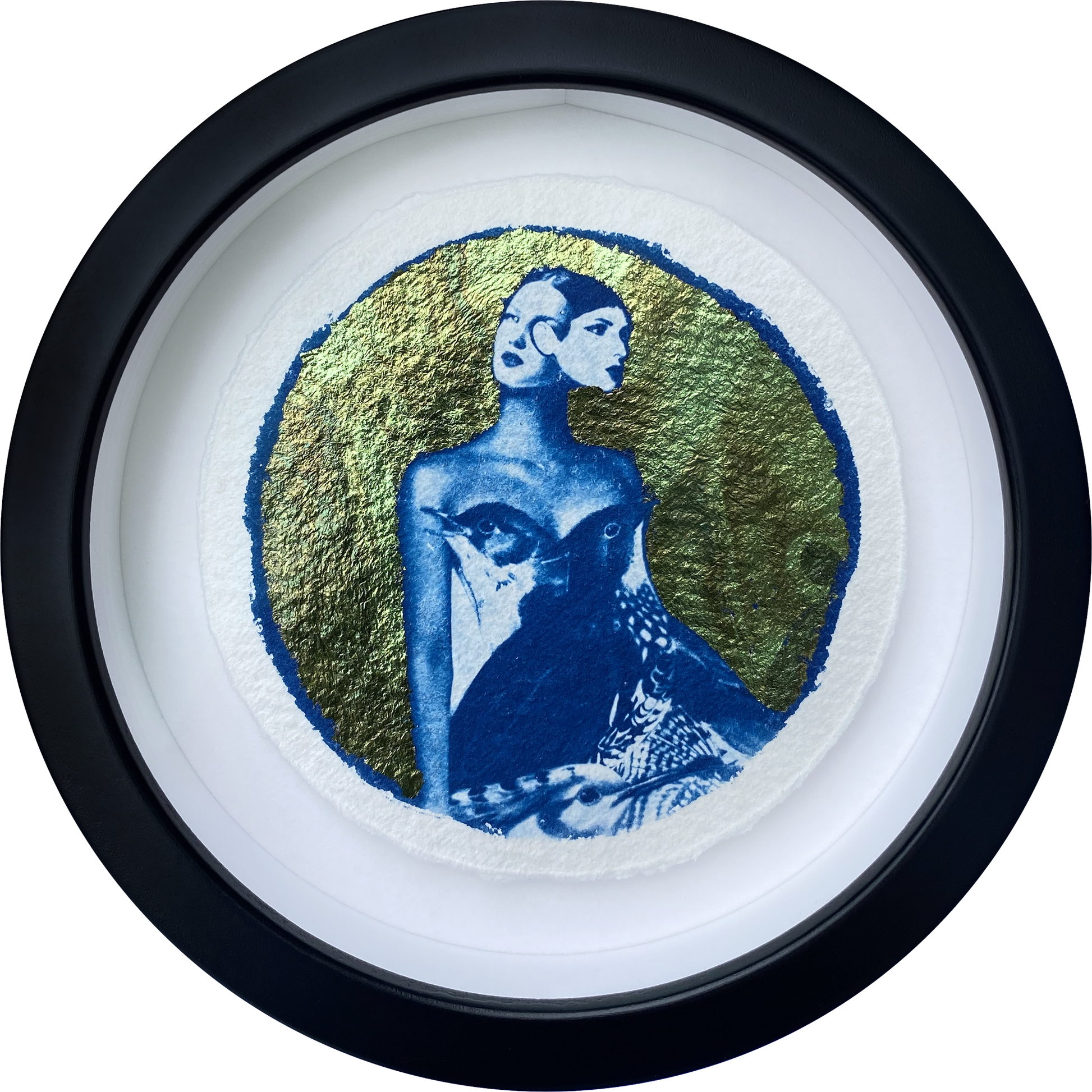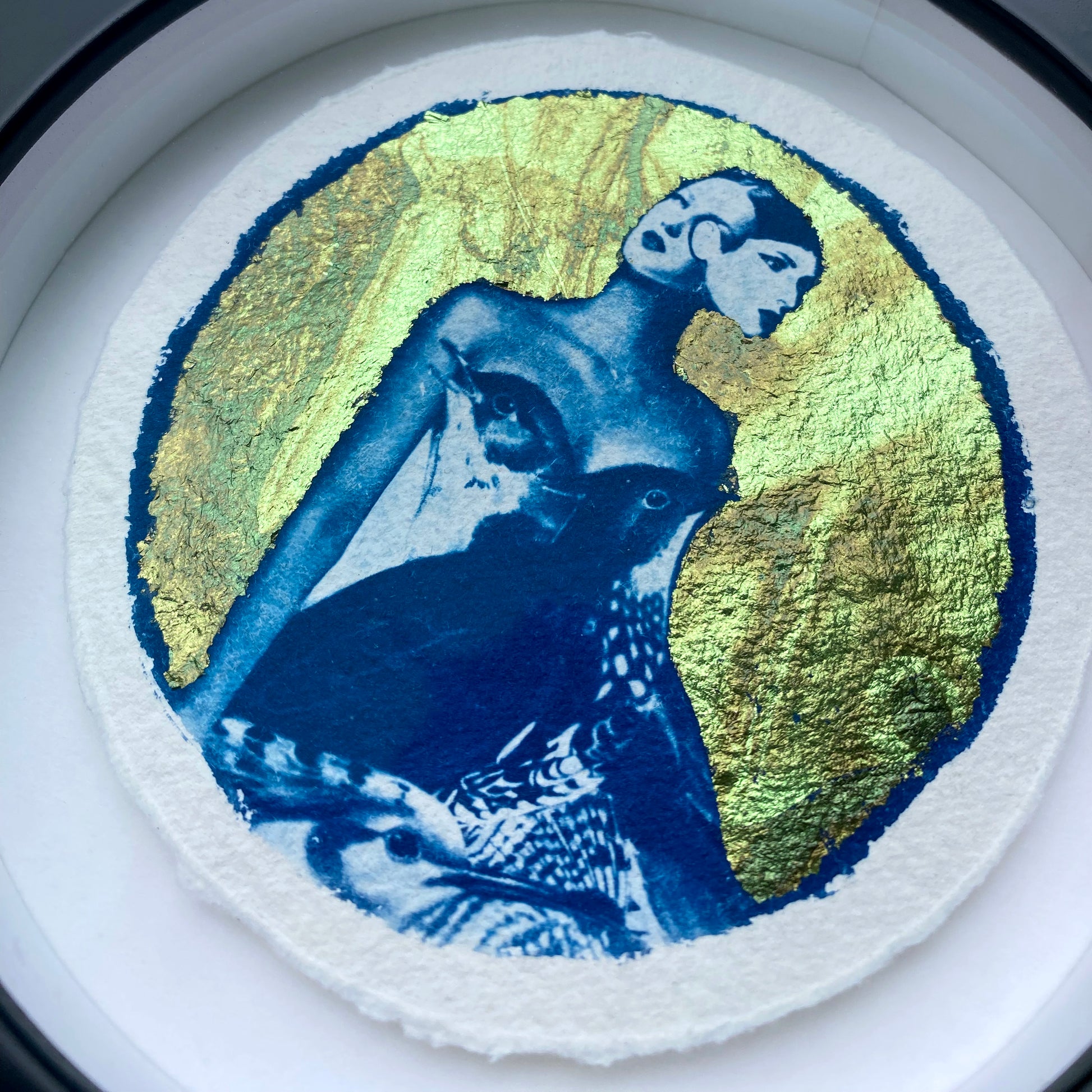 Materials | Cyanotype, handmade paper, dyed oxidized silver leaf 5.7in frame diameter x 1.2in frame depth