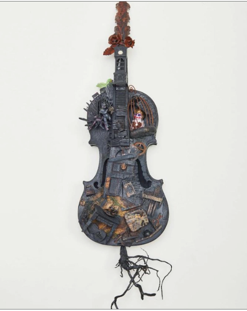Assemblage, torched violin with miniatures