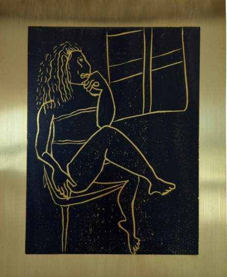 Live 20-minute model poses hand carved into pieces of linoleum. The linoleum was then inked up with printers ink and then relief printed, run through a large press, and printed onto metal.