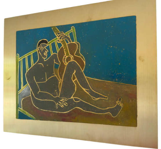 Live 20-minute model poses hand carved into pieces of linoleum. The linoleum was then inked up with printers ink and then relief printed, run through a large press, and printed onto metal.
