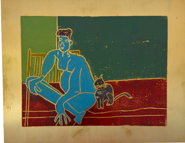 Live 20-minute model poses hand carved into pieces of linoleum. The linoleum was then inked up with printers ink and then relief printed, run through a large press, and printed onto metal.
