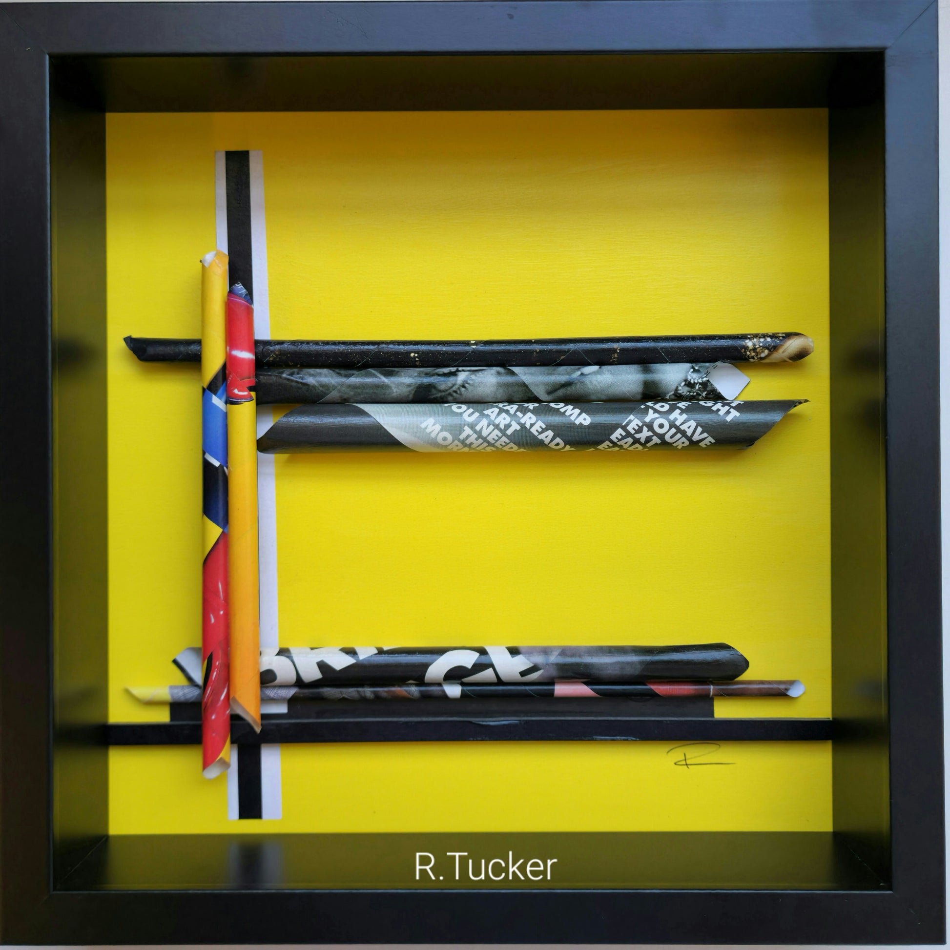Material: Collage and recycled rolled magazines on foamboard