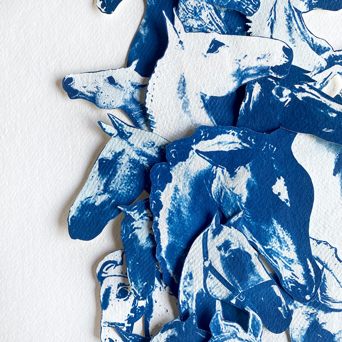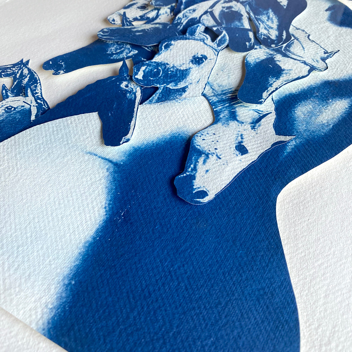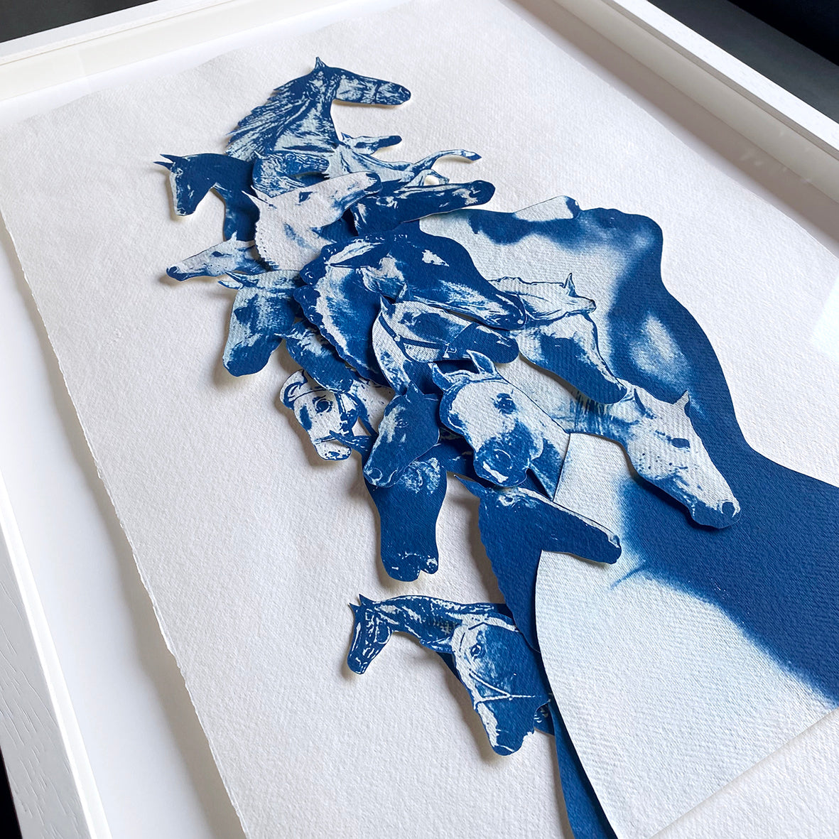 The prints are then processed by thoroughly washing in water to remove any unexposed solution. It can then be hung to dry, developing to full density Prussian blue after 24 hours. Once dried the individual component parts are cut out and mounted onto the print to create a multi-layered, 3-dimensional artwork.