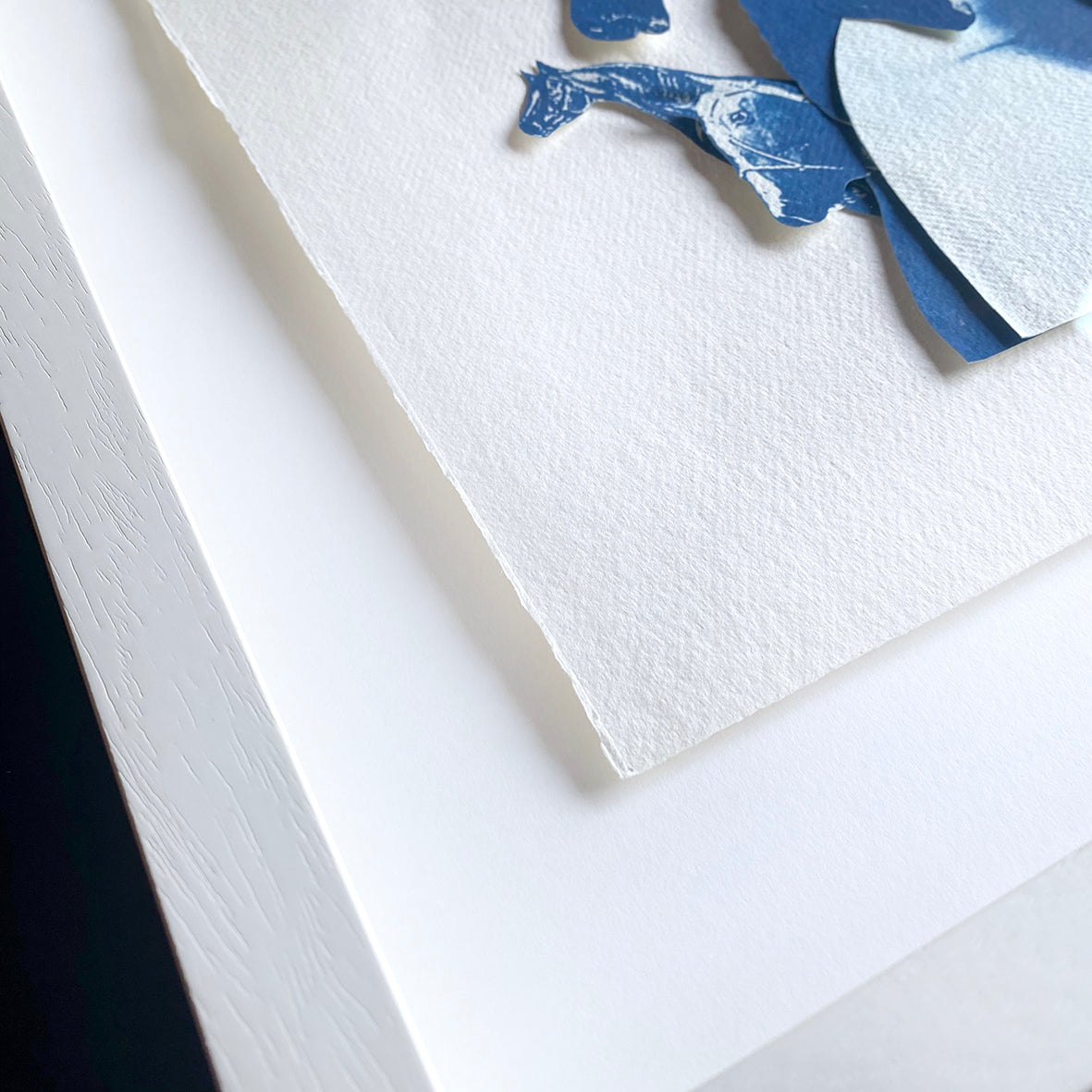 We use float mounting for all of our framed cyanotypes. The artwork floats above a