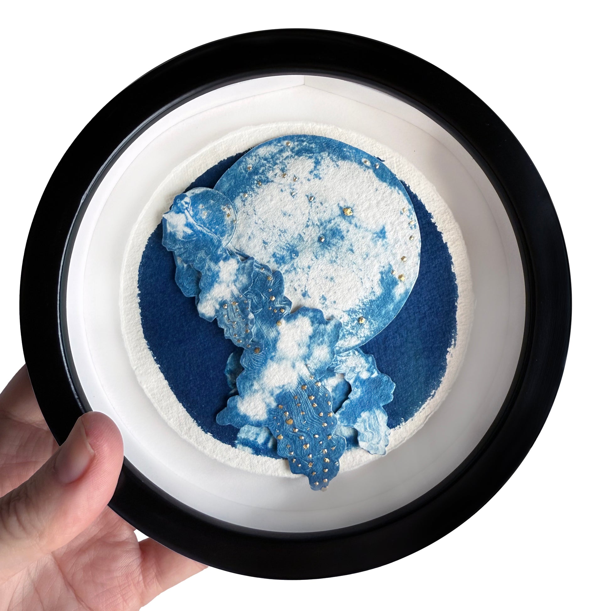 Original 3D multi-layered papercut cyanotype with 24-carat gold leaf on handmade paper