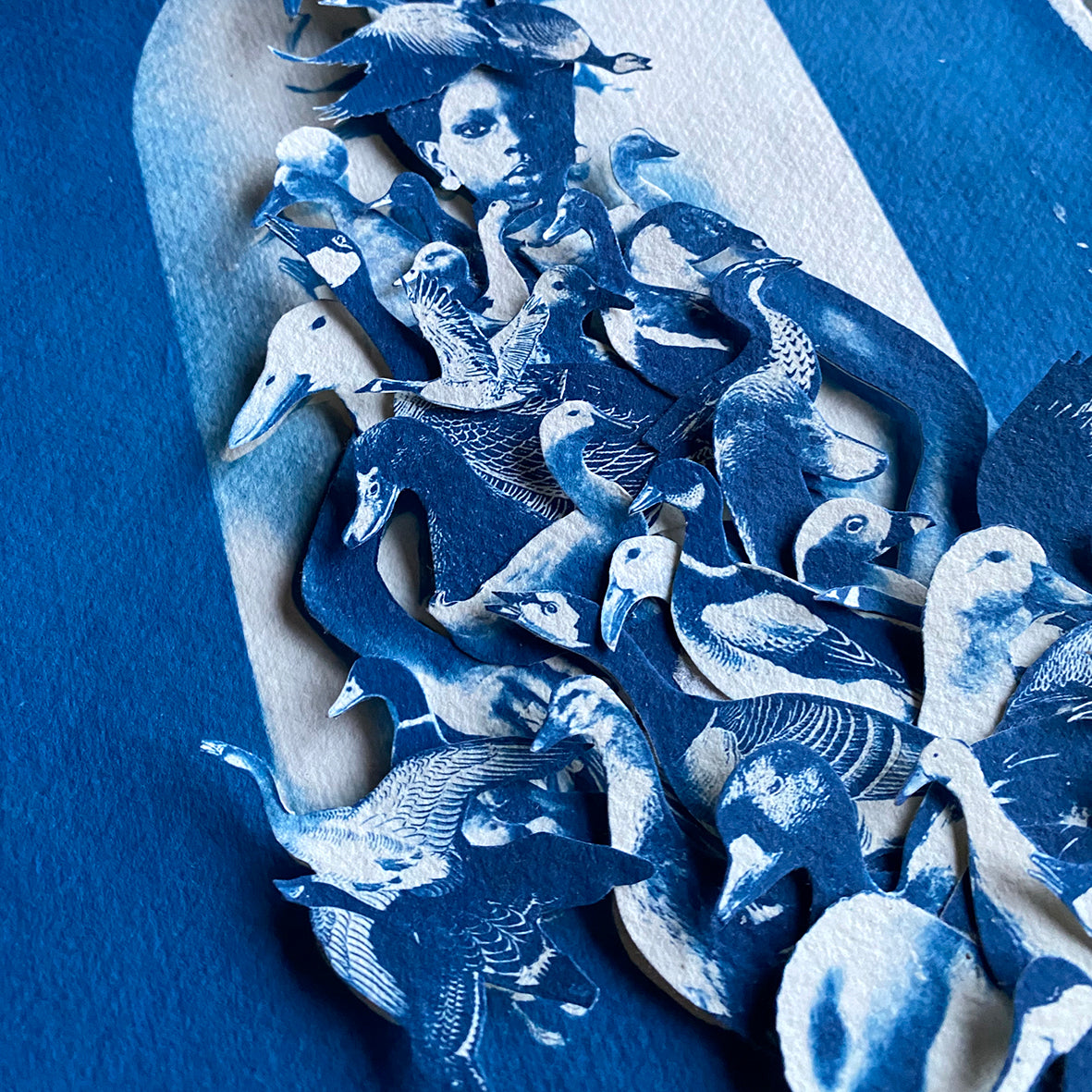 Wings of Wellness (A Tribute to Dr. Price) was created by constructing a hand-cut collage using female photographic portraiture combined with photographs and hand illustrations of ducks and geese.