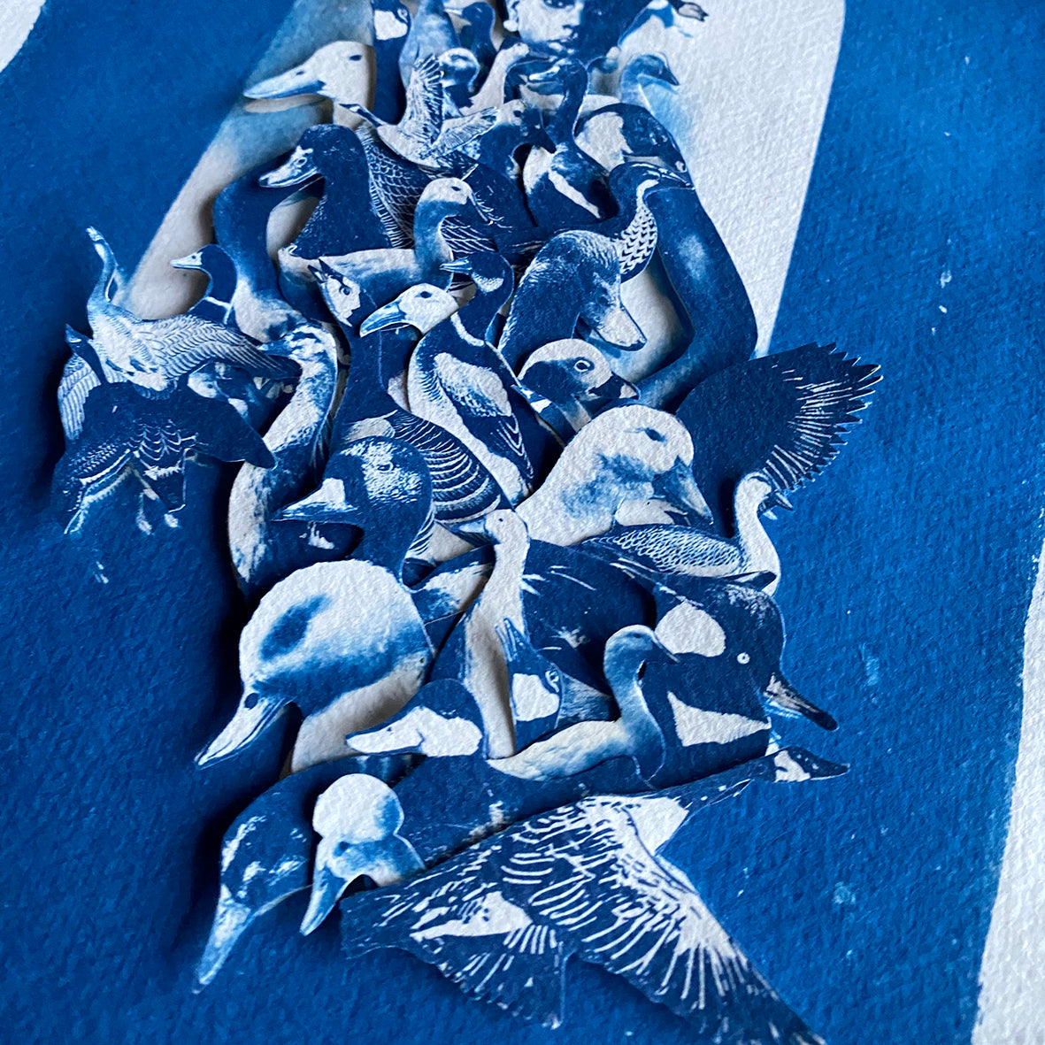 The prints are then processed by thoroughly washing in water to remove any unexposed solution, then be hung to dry, developing to full density Prussian blue after 24 hours. Once dried the individual elements are hand cut and collaged together to create a multi-layered paper cut artwork.
