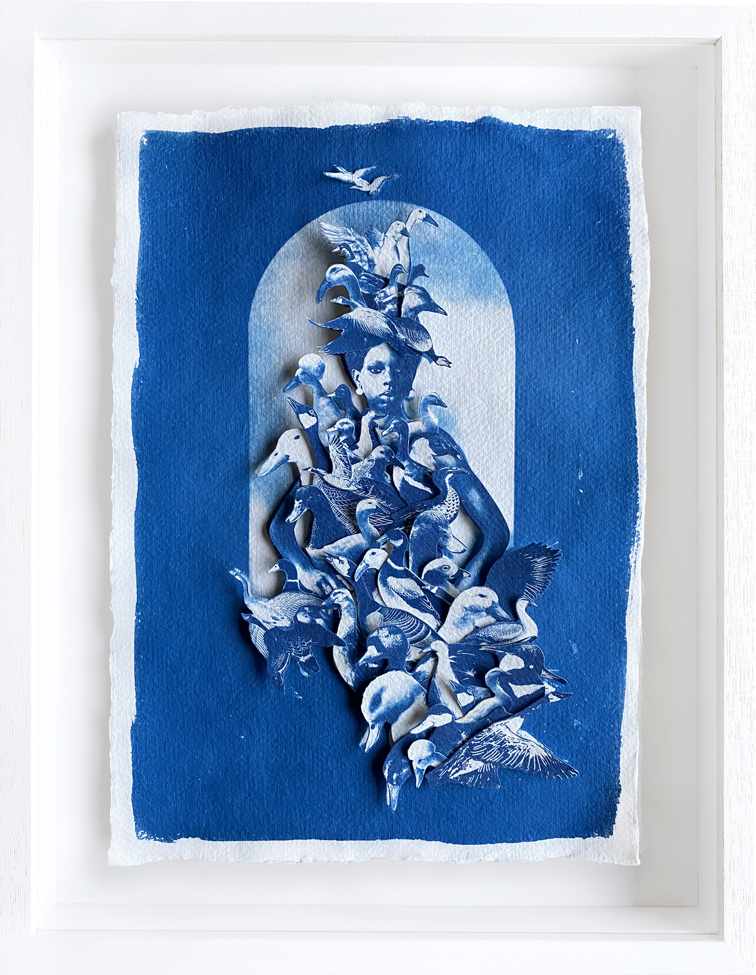 Materials | Cyanotype, 3D paper cut, multi layered collage, handmade paper 11.5in x 15in x 1.6in frame depth